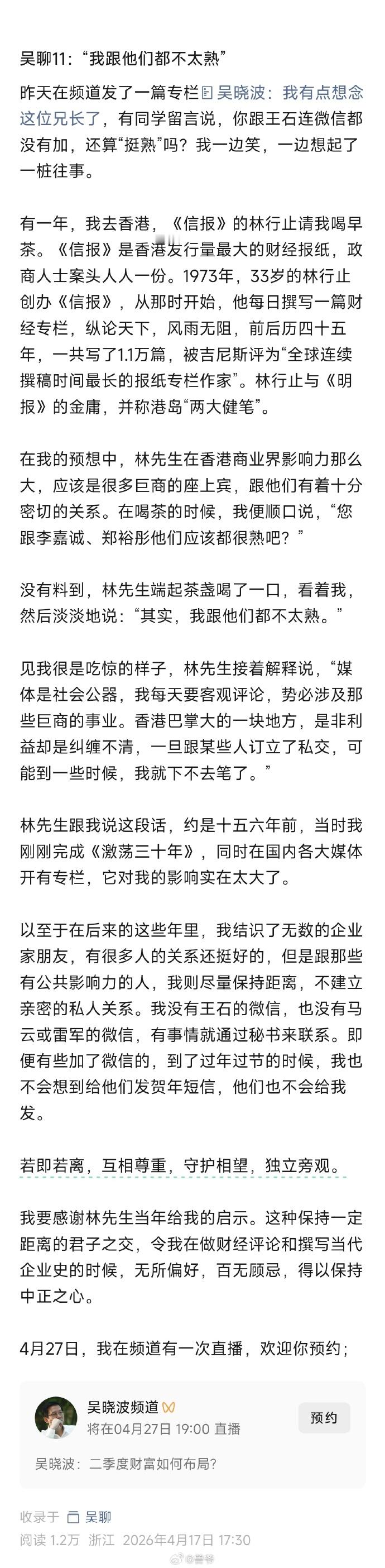 今天看到吴晓波谈王石的一篇文章,其中有两段话是这样写的:王石是一个很不容易亲近的