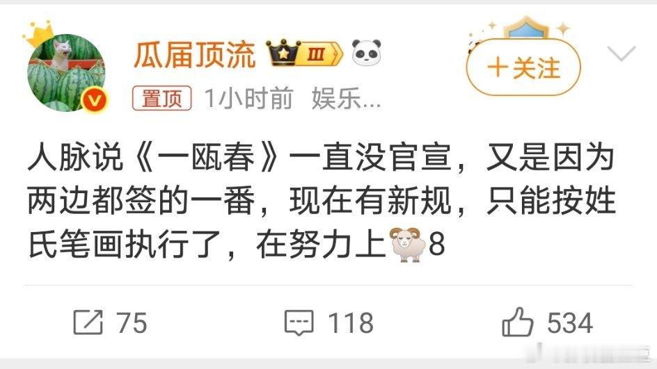 一瓯春的番位 瓜顶说男女主都是一番,如果是平番的话按照姓氏笔画数那就是许凯在前周也在后,按照双方对接发的明天物料时间看起来是挺平的