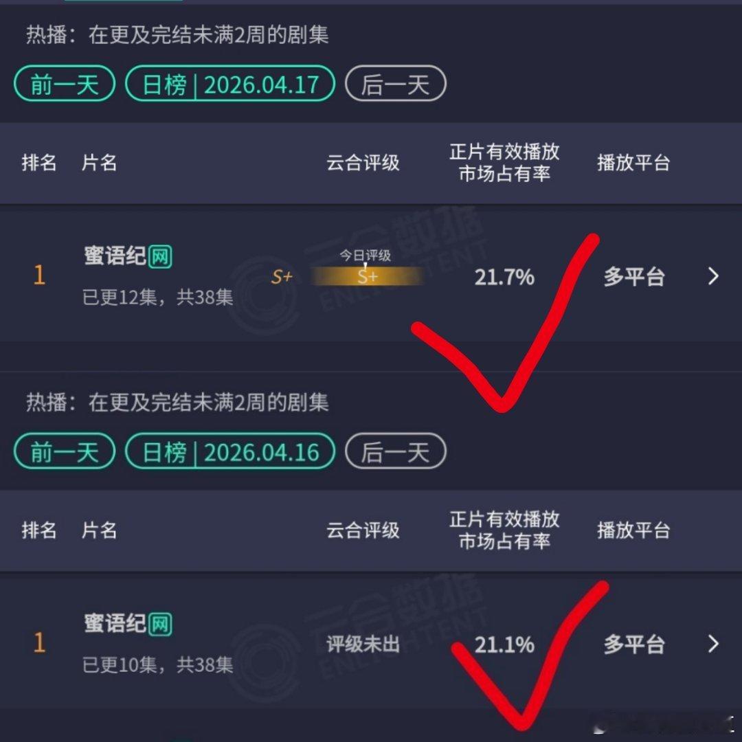 钟汉良《蜜语纪》云合评级已出,S级剧播出了S+效果,小哇宝刀未老!继昨天云合突破二十后,今天还能继续保持,就算后面横盘在这但只要保持住已经赢面很大了,从开播至今来看其实已经超出预期,纪封勇敢飞我们后面追!蜜语纪21.1%