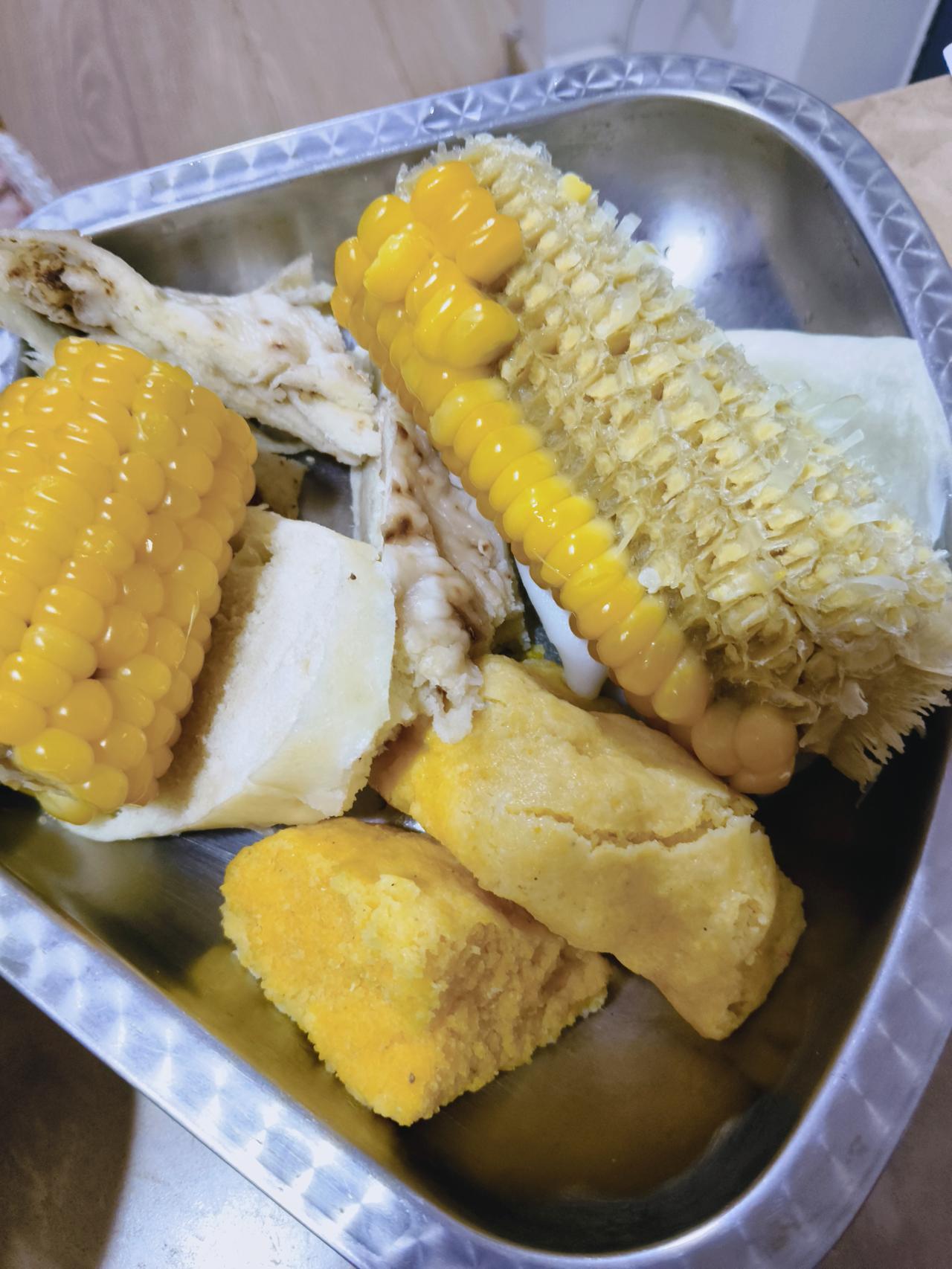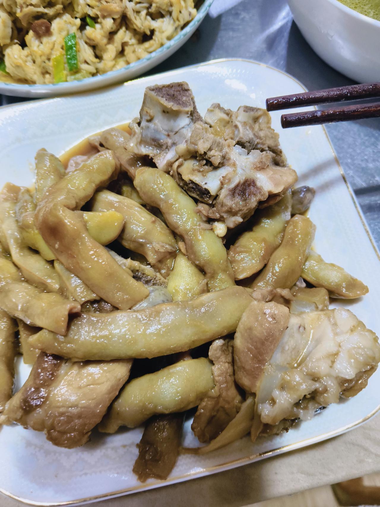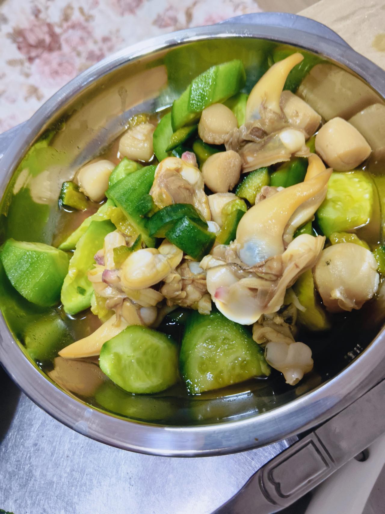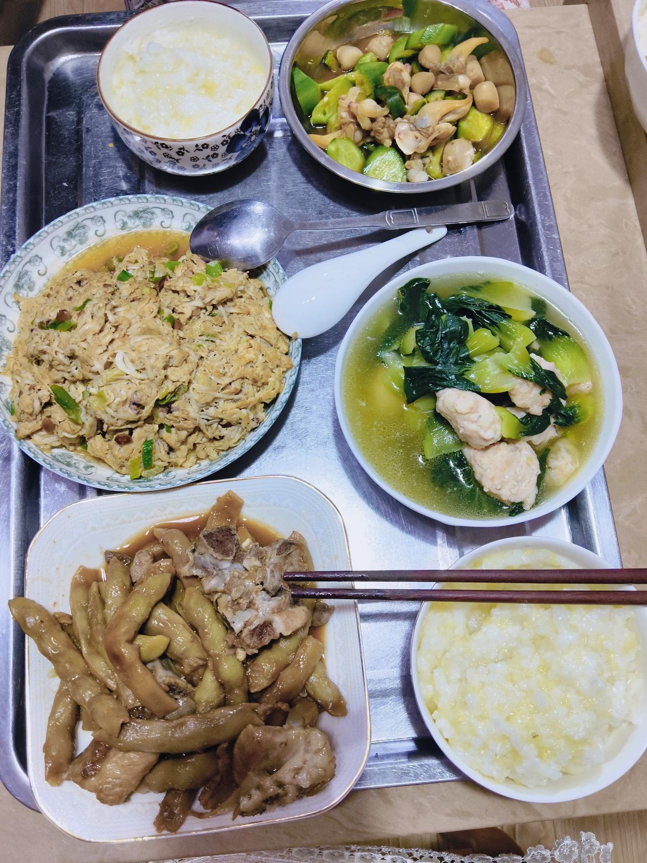 大连人,毕竟不能只用这一道菜糊弄自己,虾滑小青菜汤,蚬子肉拌黄瓜、胖头鱼干、排骨芸豆、大豆蘸酱。吃饭讲究对口,这些小海鲜最对口的是玉米饼子烀苞米,白白的大米干饭。