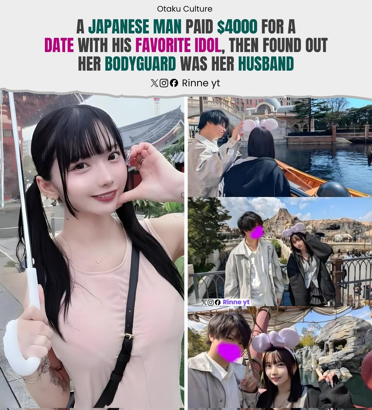 起因很简单的,下图这位日本女性是某个圈子的明星,拥有不错的粉丝数量。其中一个男粉丝花了4000美元,拿下了跟这位女性的亲密接触机会,包括一整天的日本迪斯尼行程,费用属于全包性质。