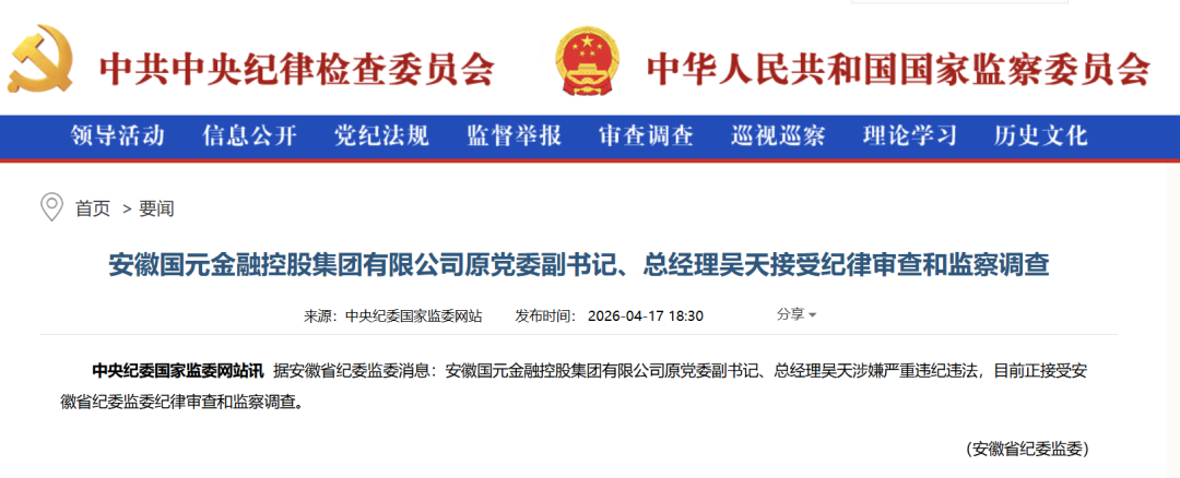 4月17日,中央纪委国家监委官网通报:安徽国元金融控股集团有限公司原党委副书记、总经理吴天涉嫌严重违纪违法,目前正接受安徽省纪委监委纪律审查和监察调查。