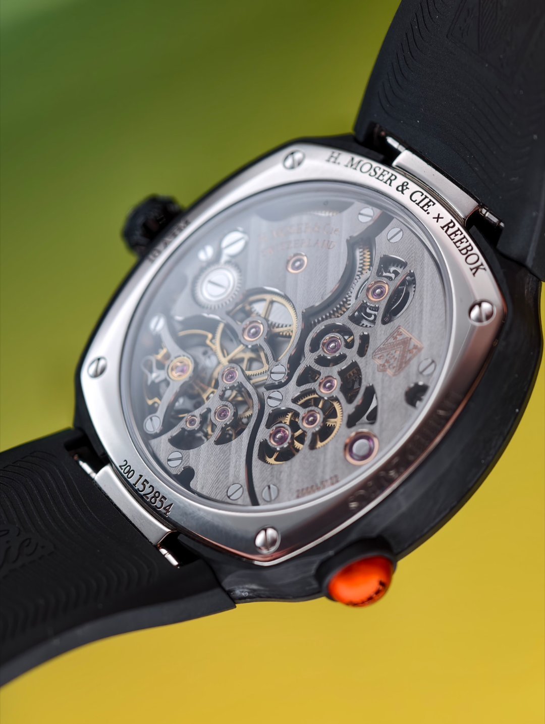 这两枚黑白新表是和 Reebok 合作的款式。并非印个 logo 的那种联名,而是更改了机芯结构来适配主题。橙色按钮为腕表“打气” ,一次按压可以带来一个多小时的走时能量。 高手带路看表展 钟表与奇迹2026