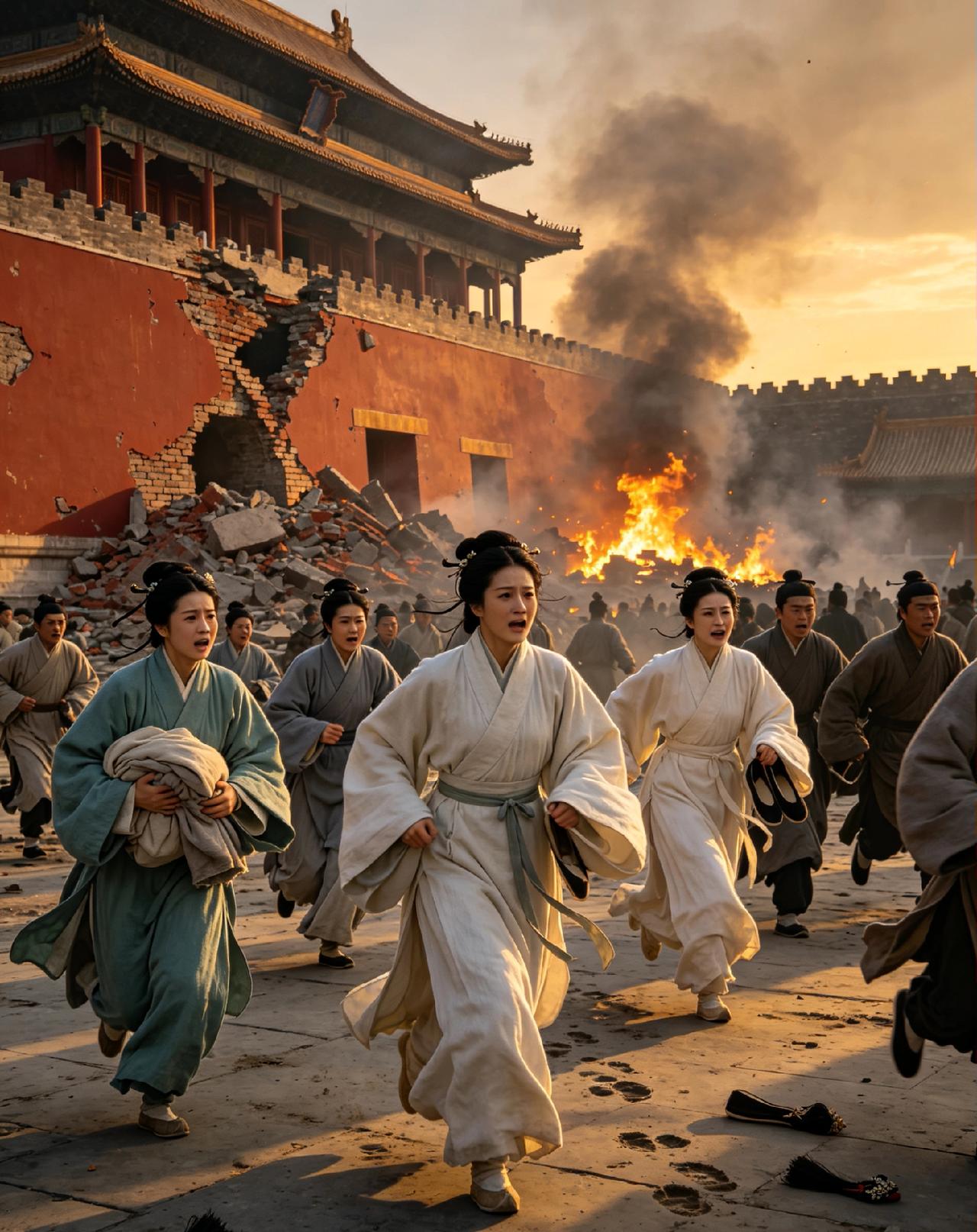 此时,宫里一片哭声,崇祯红着眼,逼周皇后自尽。