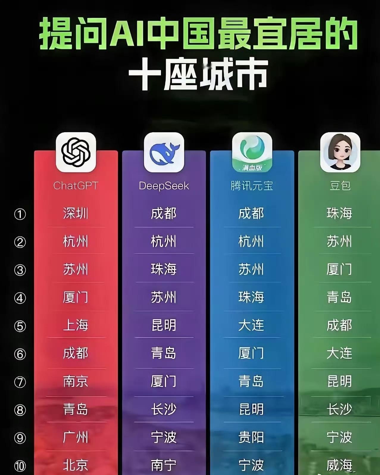 目前,没有权威渠道的中国城市宜居水平排行榜,各大AI、民间机构给出的榜单,依据的指数也都不同,何况相关影响因素都在变化。何况,有人喜欢热闹,有人喜欢历史人文,什么城市适合宜居,本就是特别主观的判断。满谈生活