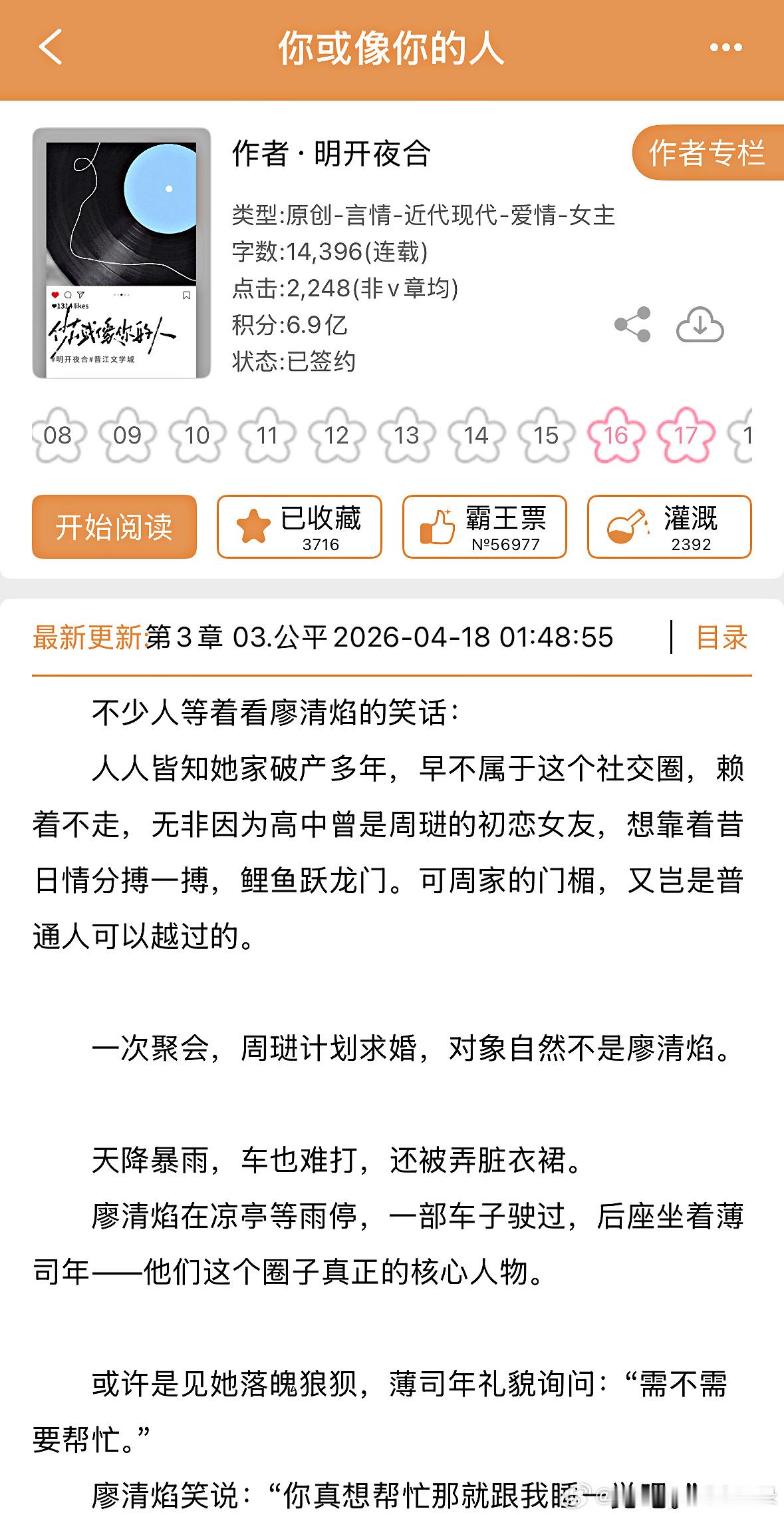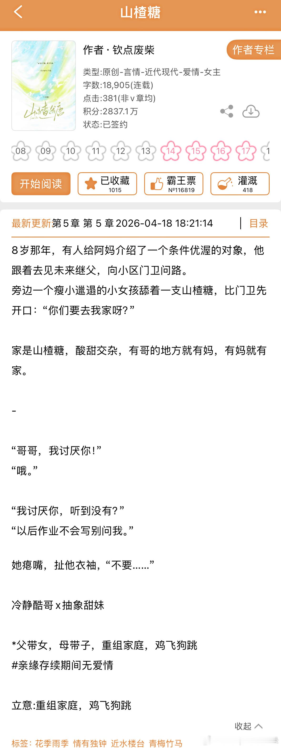 1️⃣ 《你或像你的人》明开夜合|狗血酸涩。2️⃣ 《爱情赝品》严雪芥|豪门世家,先婚后爱。3️⃣ 《山楂糖》钦点废柴|青梅竹马。4️⃣ 《末世反派是我的工作搭子》城南花开|穿书。5️⃣ 《三分钟热度》一零九六|日久生情,轻松日常。