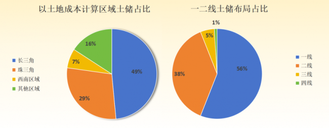 土储结构上,若以土地成本计算,长三角和珠三角合计占比约78%,西南区域占比7%;一二线城市合计占比约94%,高能级城市土储集中度持续提升。