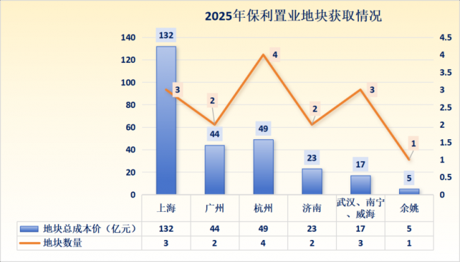 2025年全年,保利置业共获取15宗地块,涉及广州、杭州、济南、武汉等8座城市,新增总建筑面积170万平方米,总土地成本约270亿元。其中,84%资源投向广州(44亿元)、上海(132亿元)和杭州(49亿元)等一线及重点二线城市核心地段。