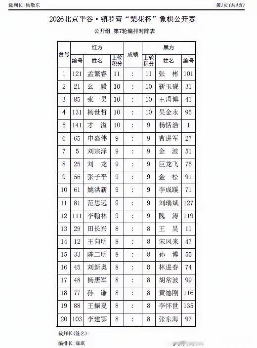 北京平谷-镇罗营“梨花杯”象棋公开赛六轮战罢,孟繁睿,张彬积11分领跑,王禹博、才溢积10分紧随。尤其是才溢胜小将巨龙飞,才溢的中残局功夫尽显。巨龙飞可是在全国个人赛上大展身手,也是未来可期的领军人物。