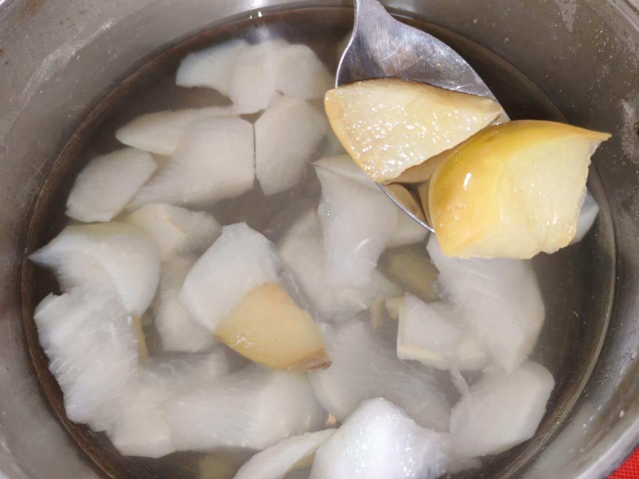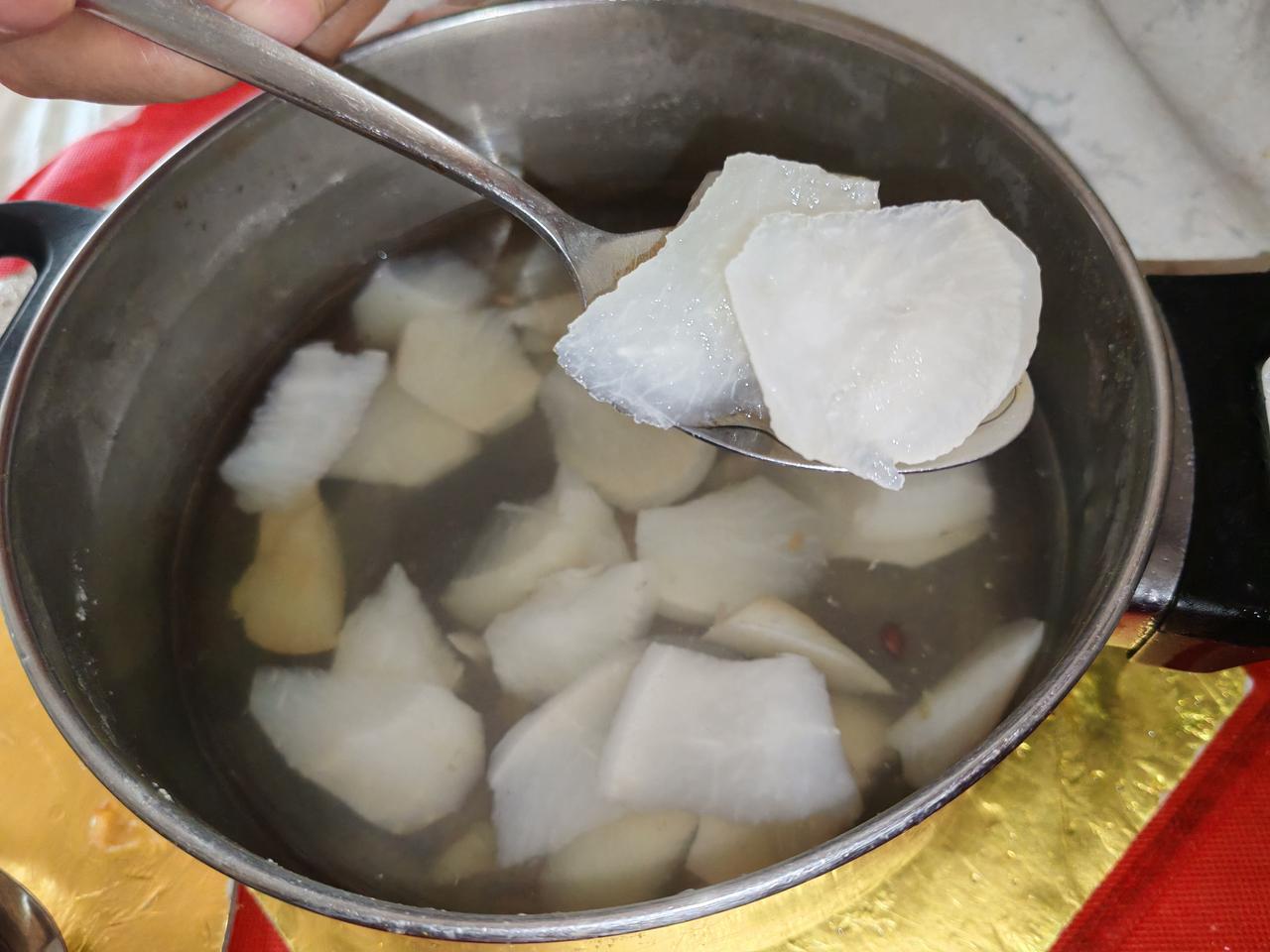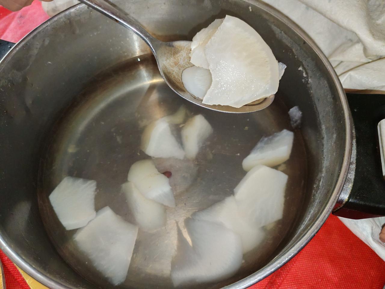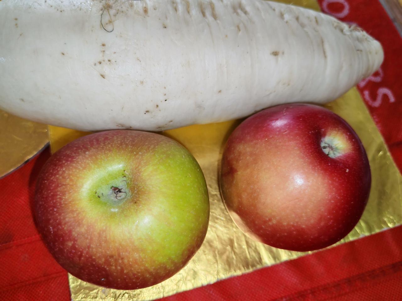 老伴最开始吃了一块萝卜,以为是梨呢,没有甜味,他就不吃了,只吃里面的苹果。