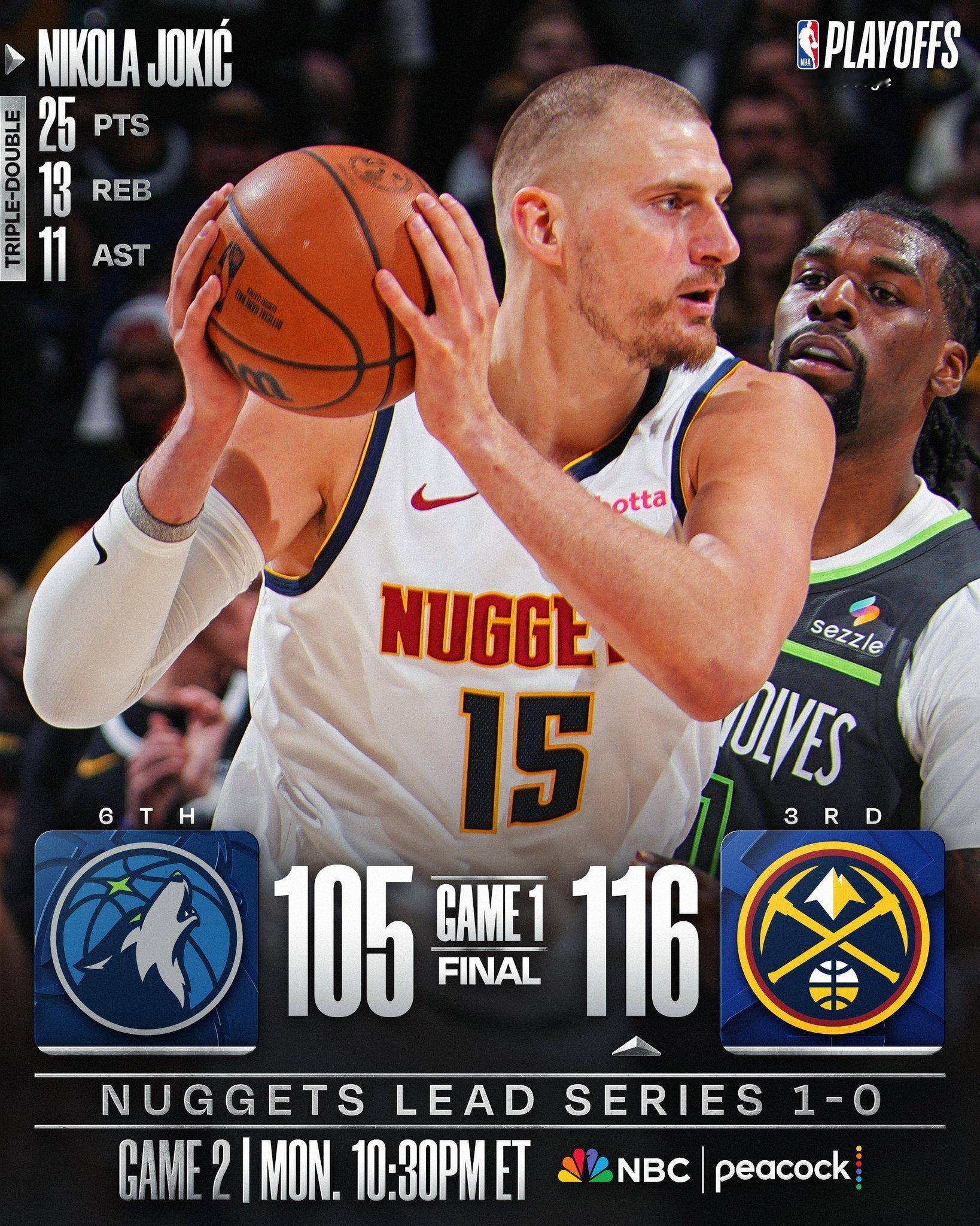 一觉醒来两个主场球队都赢了,如我所料。掘金和骑士都是大胜。骑士1比0猛龙掘金1比0森林狼