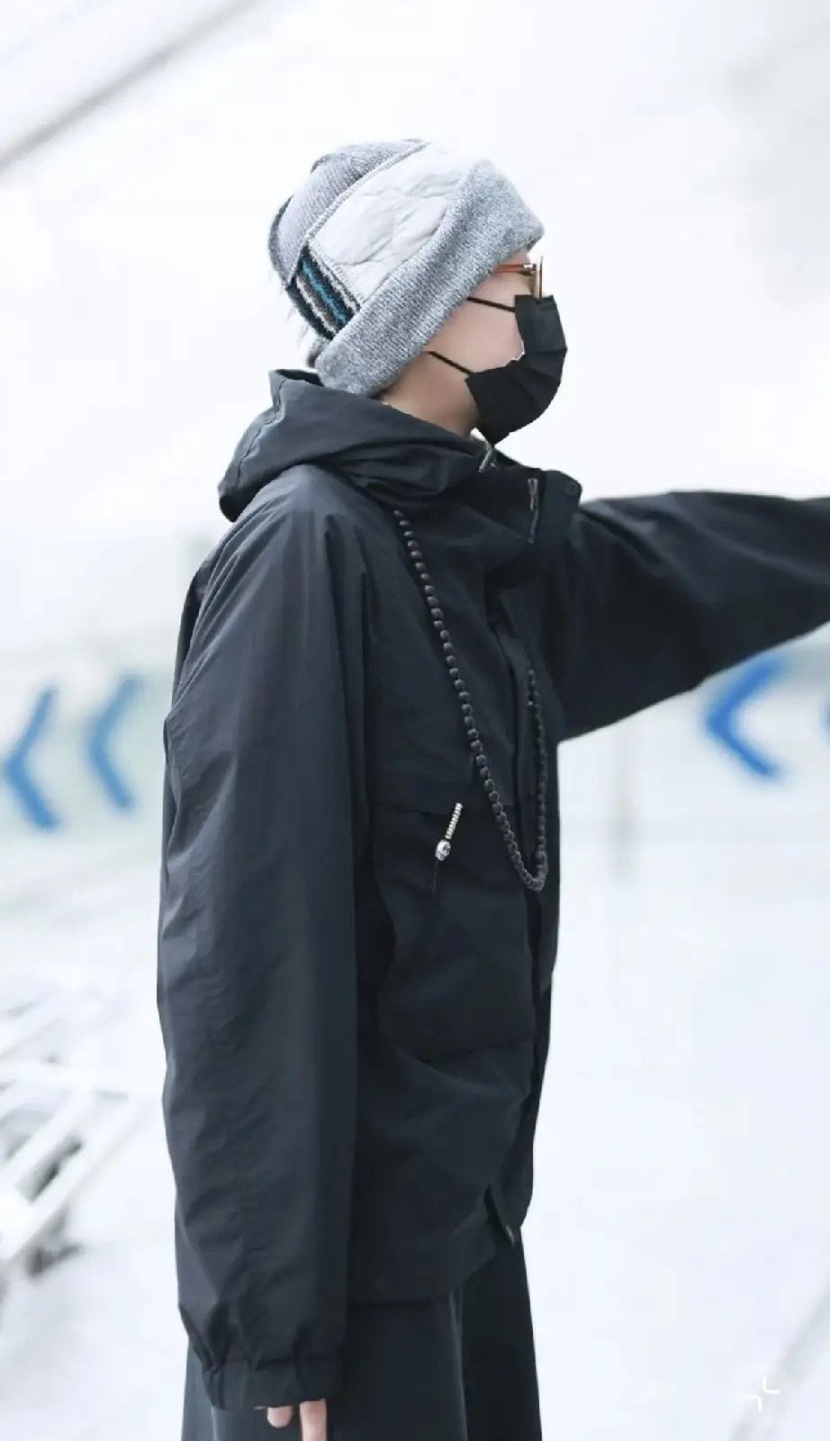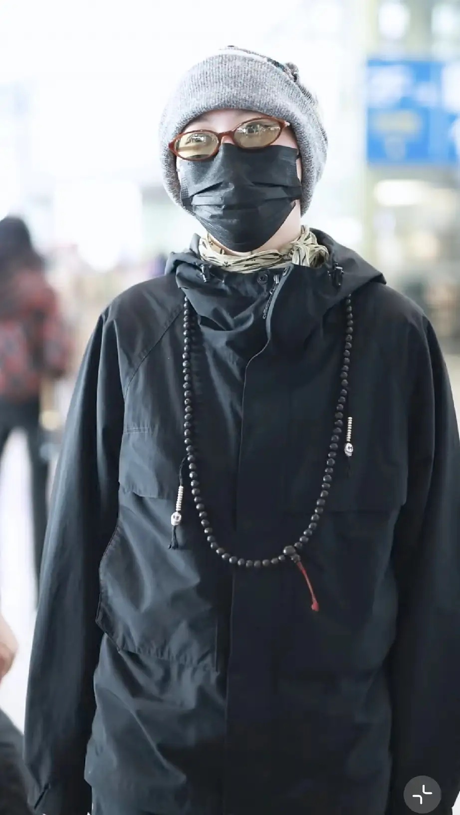 窦靖童穿了一身宽松的黑色休闲服,鞋子也是黑色的,戴着毛线帽子和黑色口罩,还戴了一副玫红色框架的眼镜,整张脸几乎被捂住了。