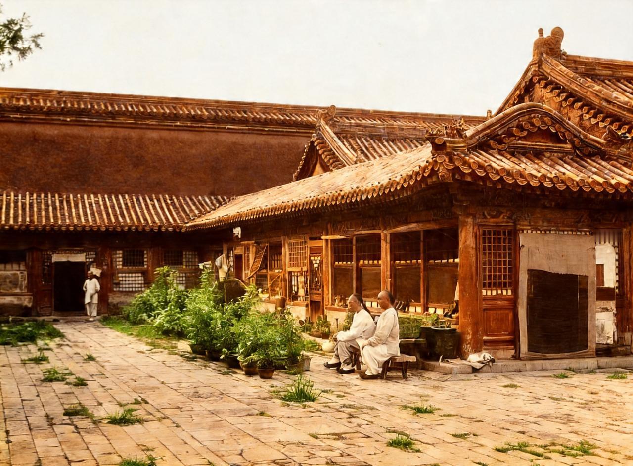 这是晚清太监坐在住所前边欣赏自己种的花草,边聊天。多数太监们虽然住在一起,但并不是影视剧中处处充斥着勾心斗角,尔虞我诈。他们之间分工明确,等级森严,规矩礼数多,服从与被服从,没有必要勾心斗角,相互倾轧。