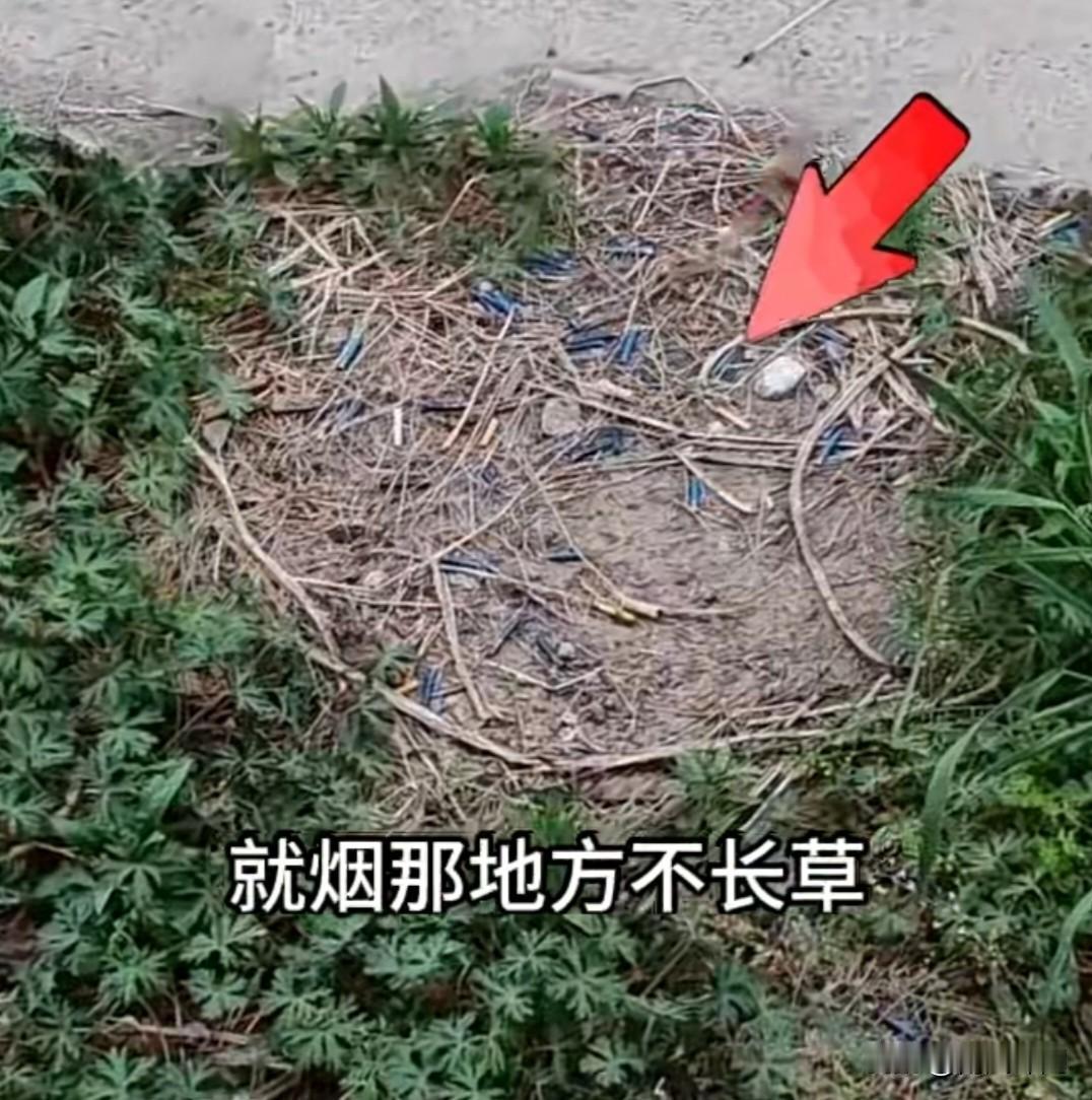 江苏有位男士,估计是图方便,每次抽烟都认准同一片草地扔烟头,长年累月下来,直接把这块地方扔得寸草不生。视频里看得清清楚楚,烟头堆积的地方,土壤光秃秃的,和旁边绿油油的草地对比,反差大到离谱,硬生生造出一块“无烟草区”。