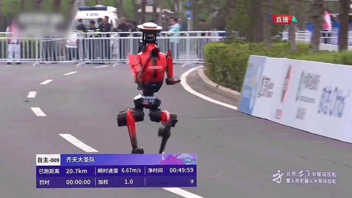 来自荣耀的绝影赤兔队遥控机器人“闪电”以48分19秒首个冲线。根据赛事加权规则,来自荣耀的齐天大圣战队自主导航机器人“闪电”以50分26秒(净用时)的成绩夺得冠军。目前人类男子半程马拉松的纪录为57分20秒。