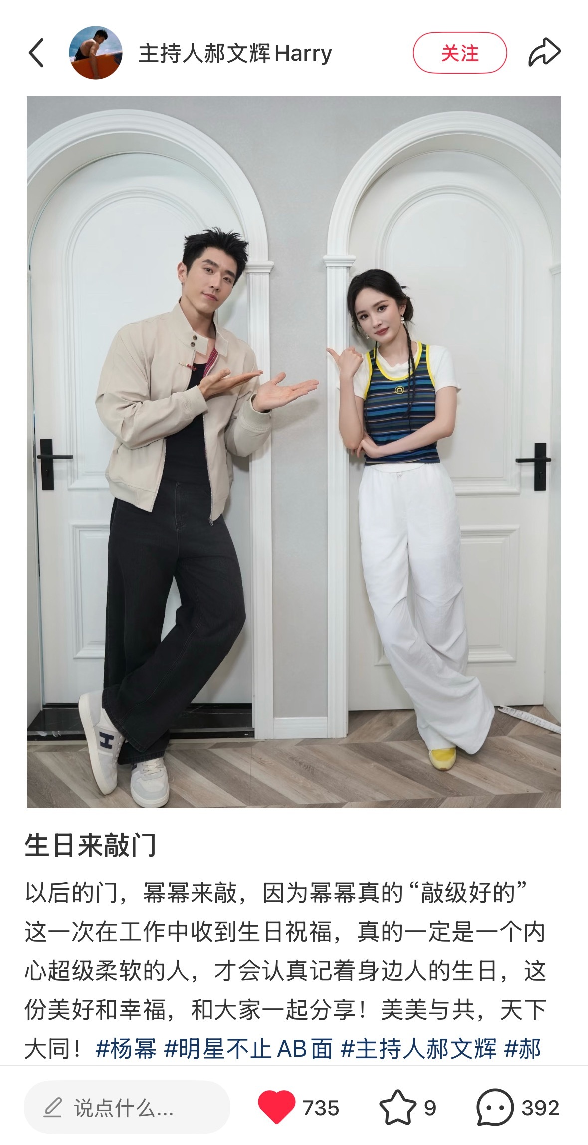 杨幂 “内心超级柔软的人,才会认真记得身边人的生日~” 杨幂就是这样的人昨天的寿星主持人郝文辉太幸福了呀,又有杨幂的生日祝福又和杨幂合影了!