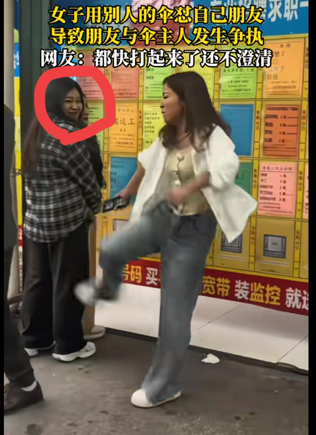 趁朋友和老大爷背过身去认真看墙上贴的广告的时候,格子女动了老大爷的雨伞,雨伞触碰到了白衣女的屁股。