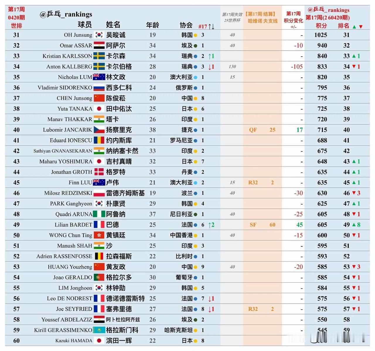 而雨果在扣除去年世界杯冠军的1120分后,排名下滑两位掉落到第五。林诗栋扣除亚军的794分后,排名跌落到第六位。其余前十名没有变化。