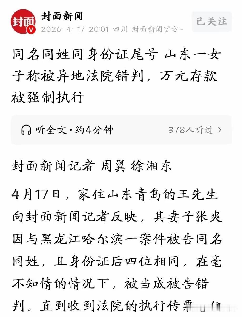 太冤了!山东青岛,女子因与一名被告同名同姓,身份证尾号后四位也相同,被千里之外的哈尔滨错判为被告,还稀里糊涂被强制划走了10000元存款。女子气炸了,自己从未去过哈尔滨,而且两人年龄相差10岁,法院审理前都不核实基本信息吗?她多次申请再审,法院却要求她必须亲自到哈尔滨,并且高额的路费和交通费也是自理,女子更是愤怒不已!