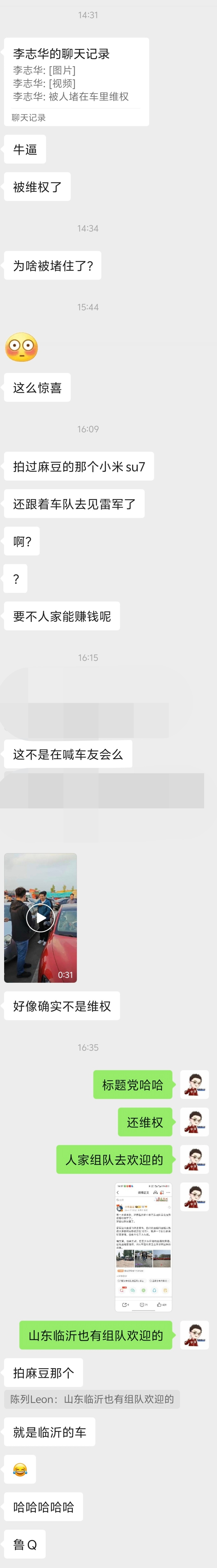 小米徐洁云喊话造谣者今天我们群里也看到有人发这个聊天记录,这个叫李志华的造谣者必须告他,让它受到法律的惩罚,真的是太坏了,明明就是小米车友会的车友去欢迎雷总,竟然也能造谣说是去维权,还好在现场的车友们都出来辟谣了。