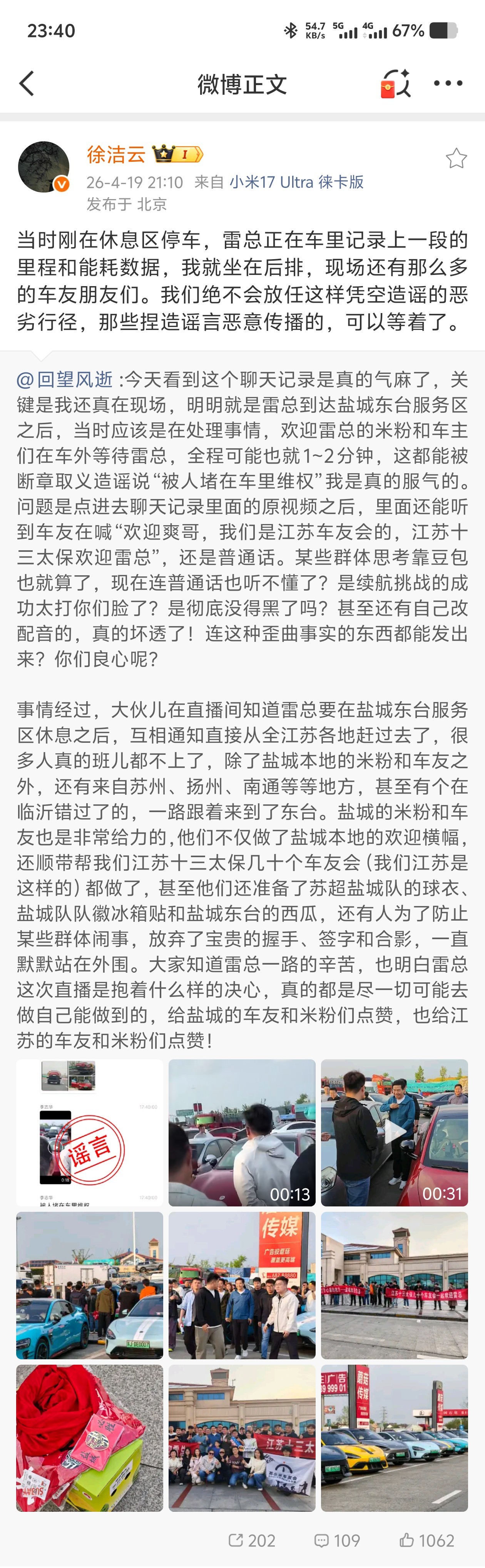 这种造谣者必须得惩罚他,要不然他们的违法成本太低了,而且没有认真看,没有仔细去搜索的不明事理的网友,真的会被误导,你看我们群里一开始就有人以为是真的维权,我还特地说明是标题党,造谣一张嘴,实际是车友和米粉欢迎雷总,不仅是江苏的,山东临沂的也有,这就是真人气,车友们自发组织的,真的假不了,假的真不了,造谣者等着吧,法律会惩罚你们的。