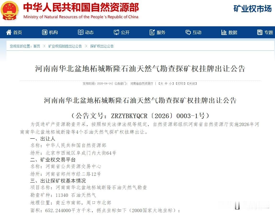 【商丘两个地方石油天然气探矿权挂牌出让】日前,为促进矿产资源勘查开采,按照相关法律法规等规定,自然资源部组织河南省自然资源厅实施2026年河南南华北盆地柘城断隆等4个石油天然气探矿权挂牌出让,其中有两个涉及到商丘。详情如下。↓↓↓(via自然资源部网站)