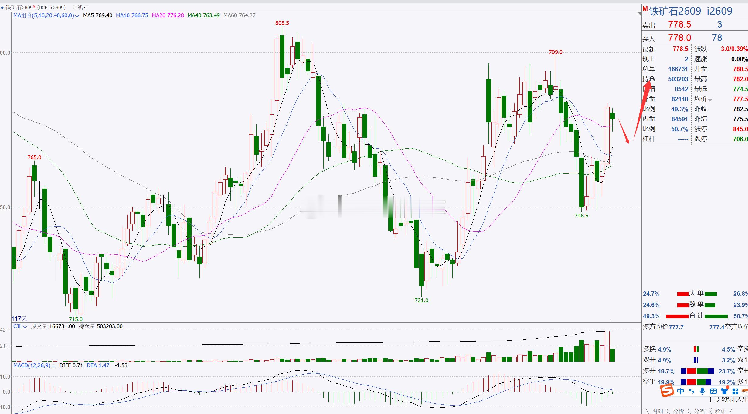 3、【铁矿石2609】铁矿石回踩短期偏多!铁矿石目前处于反弹上调阶段,后市建议回踩短线偏多,继续看短期反弹修正,重点关注800整数一带,稳健者建议先观望;例如多关注768—765附近,上方先关注800附近;空关注800突破情况再择机考虑介入;(建议仅供参考,具体操作以开盘点位实时跟进,据此操作风险自担)焦煤螺纹热卷铁矿石
