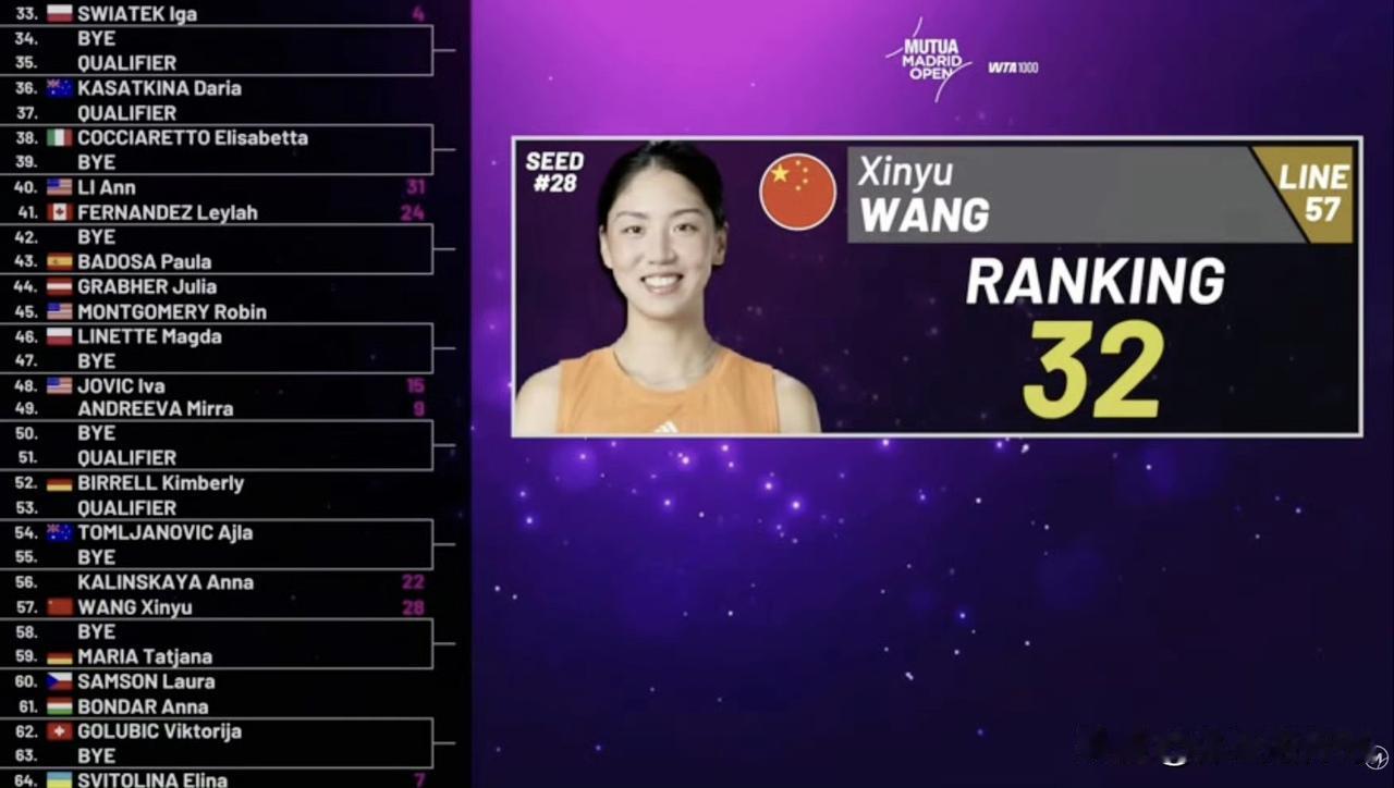 王欣瑜首轮同样轮空,第二轮将对阵玛利亚和萨姆森的胜者,第三轮的潜在对手是7号种子斯维托丽娜。