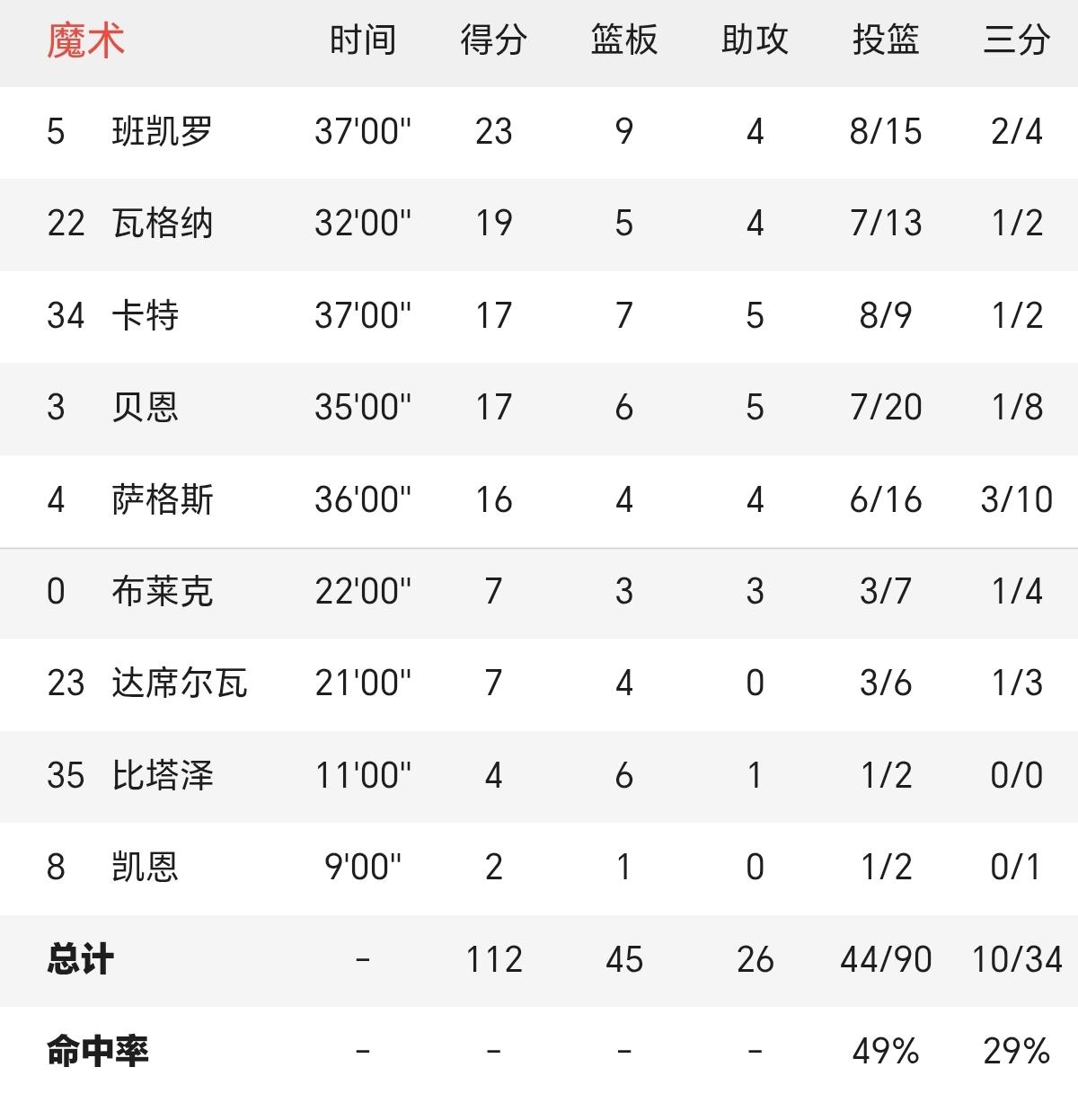 虽然凯德·坎宁安砍下全场最高的39但活塞其他球员表现低迷,只有哈里斯拿到17分。而魔术先发五虎得分全部上双,最终客场112:101大胜,夺回主场优势。