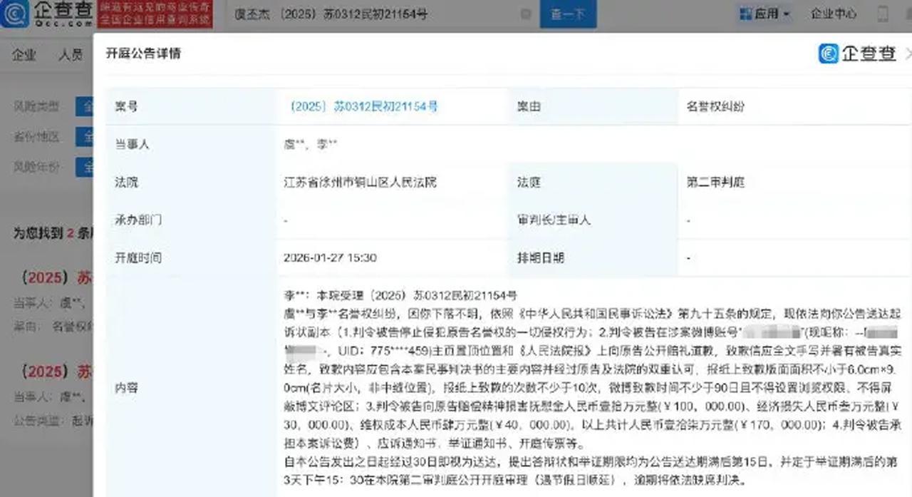 近日,虞书欣父亲虞丕杰起诉一名高三学生名誉侵权,索赔17万元并要求公开道歉一案,迎来一审判决。徐州市铜山区法院驳回其全部诉讼请求,案件受理费由虞丕杰自行承担,目前其已提起上诉。此事迅速冲上热搜,背后是无数普通人对言论边界、舆论监督与名誉维权的高度关注。
