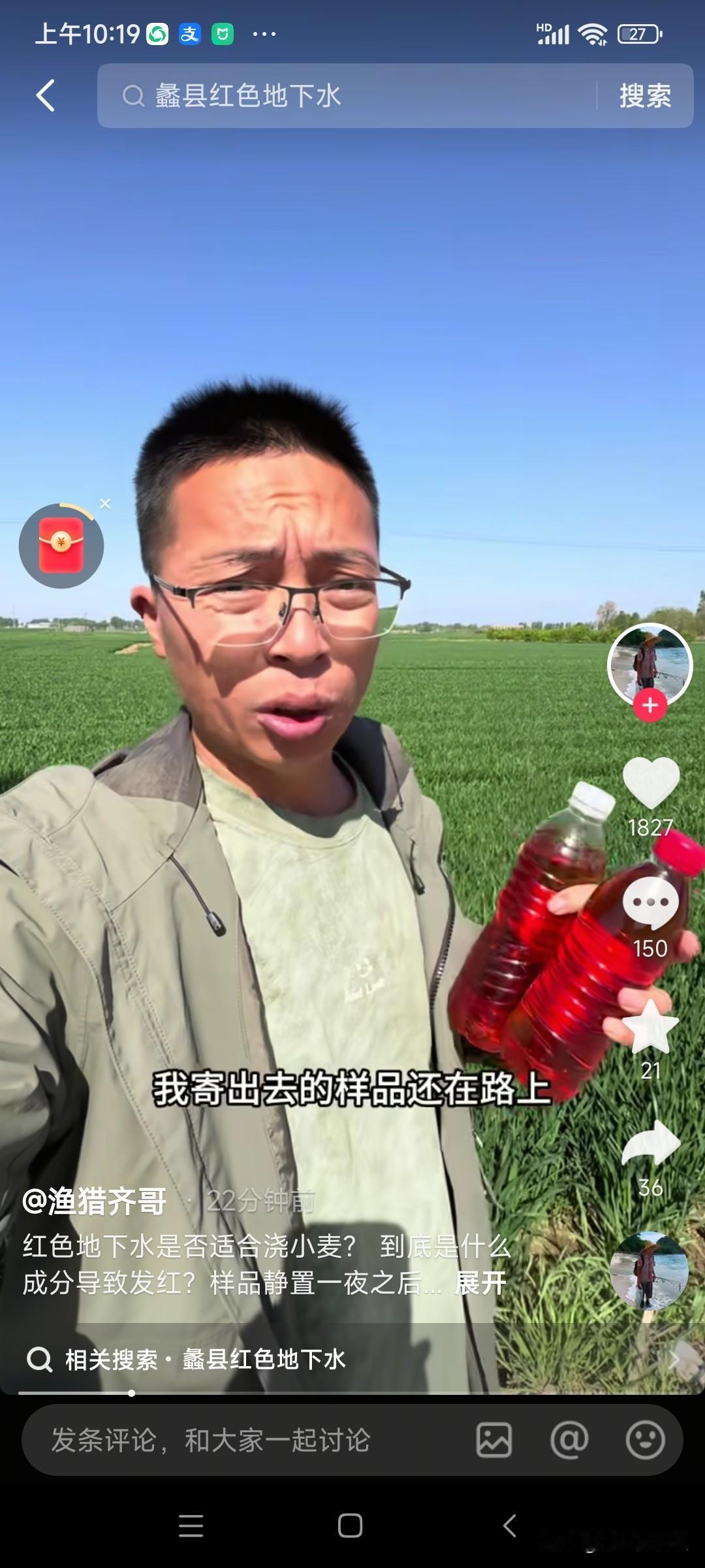 4月19日,抖音博主“渔猎齐哥”发布了一段视频,他接到粉丝提供的线索,说河北省保定市蠡县一村庄的水井抽出的水是红色,带着疑问他来到了这个村庄。经过走访村民得知这里的井水呈红色好几年了,种的麦子自己不敢吃,全部卖掉。博主经过抽水,发现井水确实呈红色。是什么造成的,红色水有没有害性?博主已取样送至相关部门和检测机构,相信很快就能真相大白。