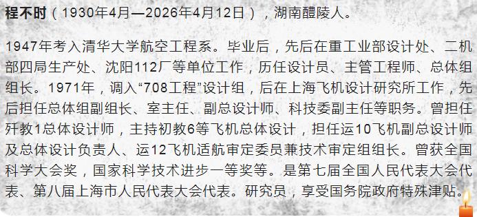 4月12日凌晨,新中国第一代飞机设计师、航空工业泰斗程不时先生逝世,享年96岁。