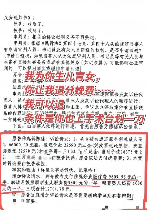 陈明在诉状里提的要求非常绝:第一,要求解除两人的同居关系,退还那10万多元的彩礼和金饰,第二,李捷生孩子的住院费、请月嫂的钱,必须平摊,甚至连孩子的奶粉钱,李捷也要出一半,第三,李捷自己带过去的嫁妆,他一分钱都不想给。
