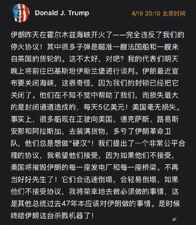 要说“杀戮机器”还轮不到伊朗,这顶“桂冠”非美以莫属。为期十四天的美伊停战协议即将到期,特朗普为了逼迫伊朗在第二轮谈判中跪下,4月19日,在个人推特上发文对伊朗又是指责,又是嘲讽,又是恐吓,最后说要“终结伊朗这台杀戮机器”云云。这是睁眼说瞎话,颠倒黑白。