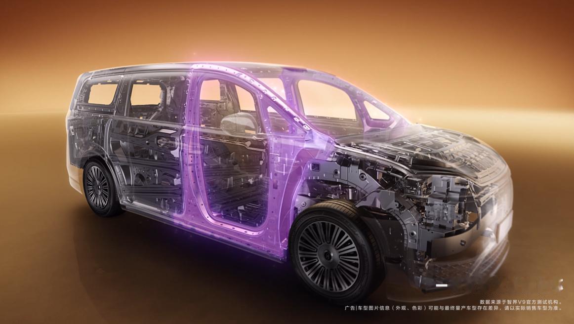 智界V9这次首发的全维包裹安全气囊,直接集成在二排座椅靠背里,座椅怎么调,气囊就怎么跟。碰撞瞬间展开成U型环绕结构,像兜帽一样包住头、颈、胸。侧碰时它是一道柔性墙,防止左右乘员头碰头;大躺姿遭遇正碰,还能隔开头与膝盖、头与胸部,避免脊椎对折伤害。加上高达91.6%高强钢+铝合金的硬核车身结构,相当于给安全加了道双保险。