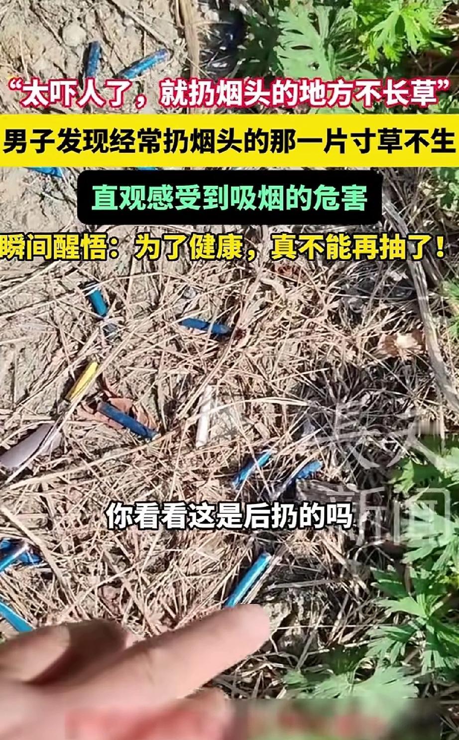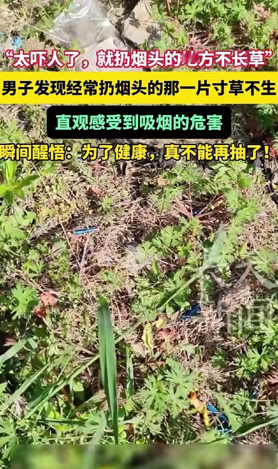 太恐怖了!江苏一位男子,他平时烟瘾不小,抽完烟总习惯往后院草地里随手一扔,从未觉得不妥!结果有一天他下楼一看,发现那个扔烟头的地方,草全死了,光秃秃一片,旁边没扔过烟头的地方,草长得绿油油的。看完后怕不已直说“戒烟真的刻不容缓,不能再抽了”。