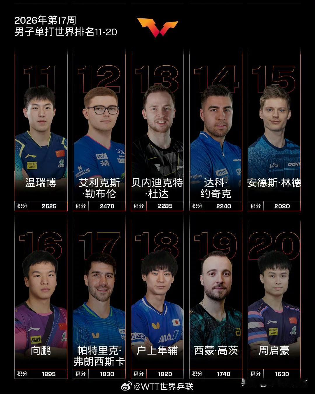 弗朗西斯卡上升2位至第17,西蒙·高茨拉斯上升1位至第19,周启豪上升2位闯入前20。法国选手力廉·巴德本期飙升8位至第49,成为男单上升幅度最大的选手。国乒其他选手里温瑞博位列第11,梁靖崑排名继续下滑,已经跌到第21位,陈垣宇位居第25,陈俊菘位列第37,梯队分布保持稳定。