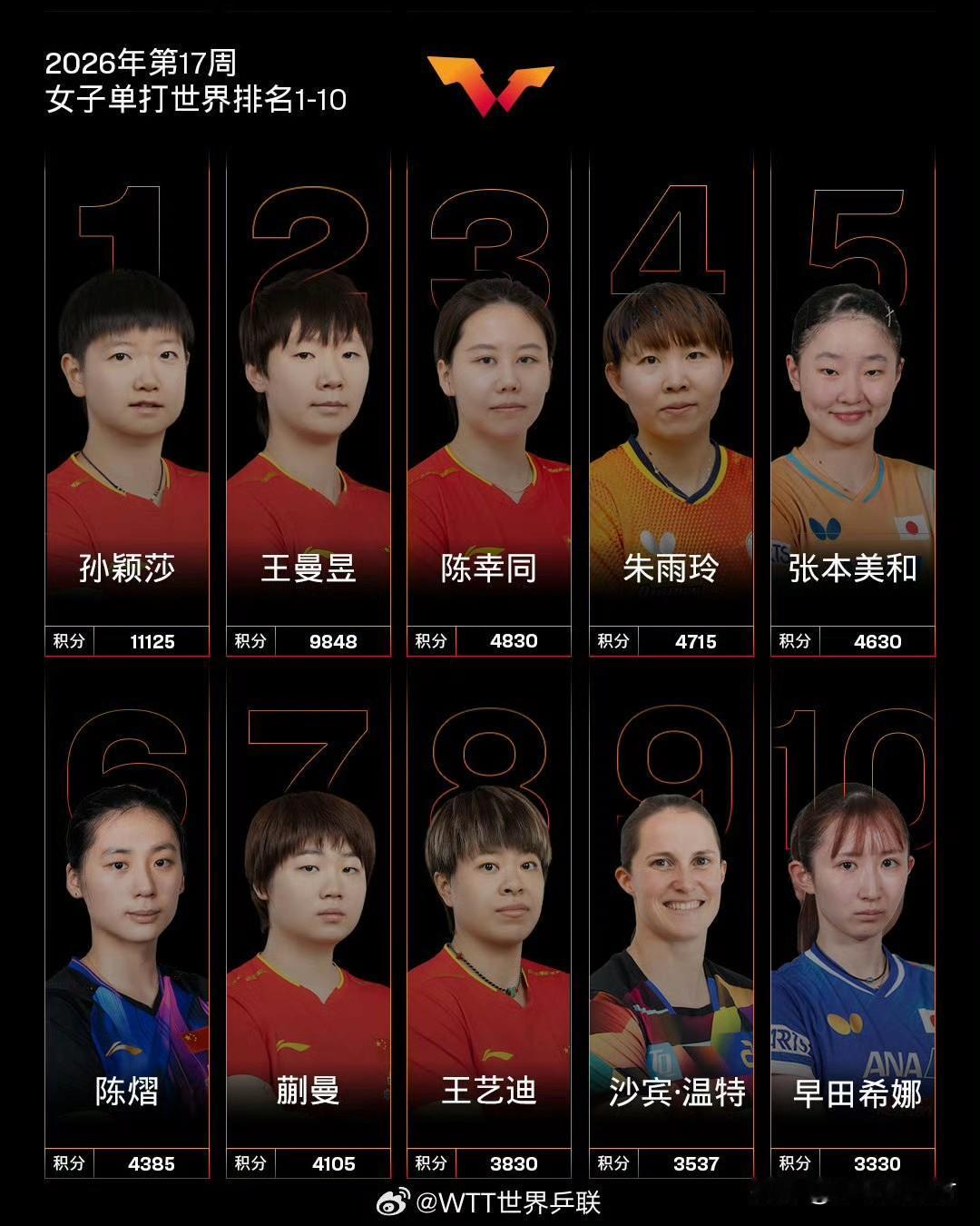 国际乒联17周排名:孙颖莎优势缩水 栋曼集体下滑 梁靖崑跌出前20名