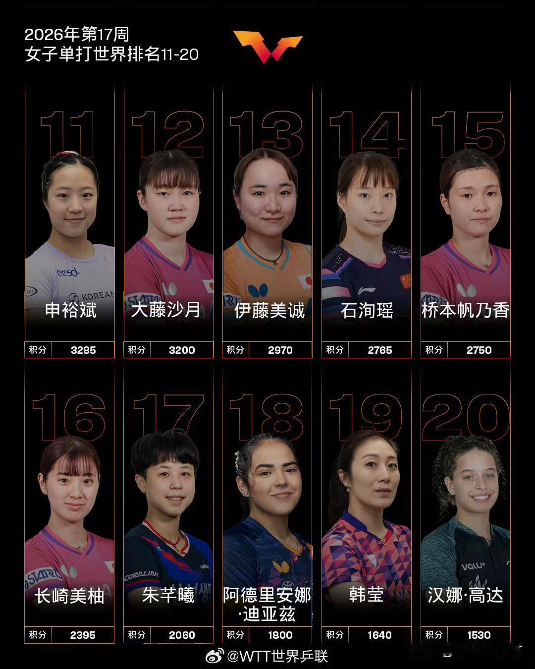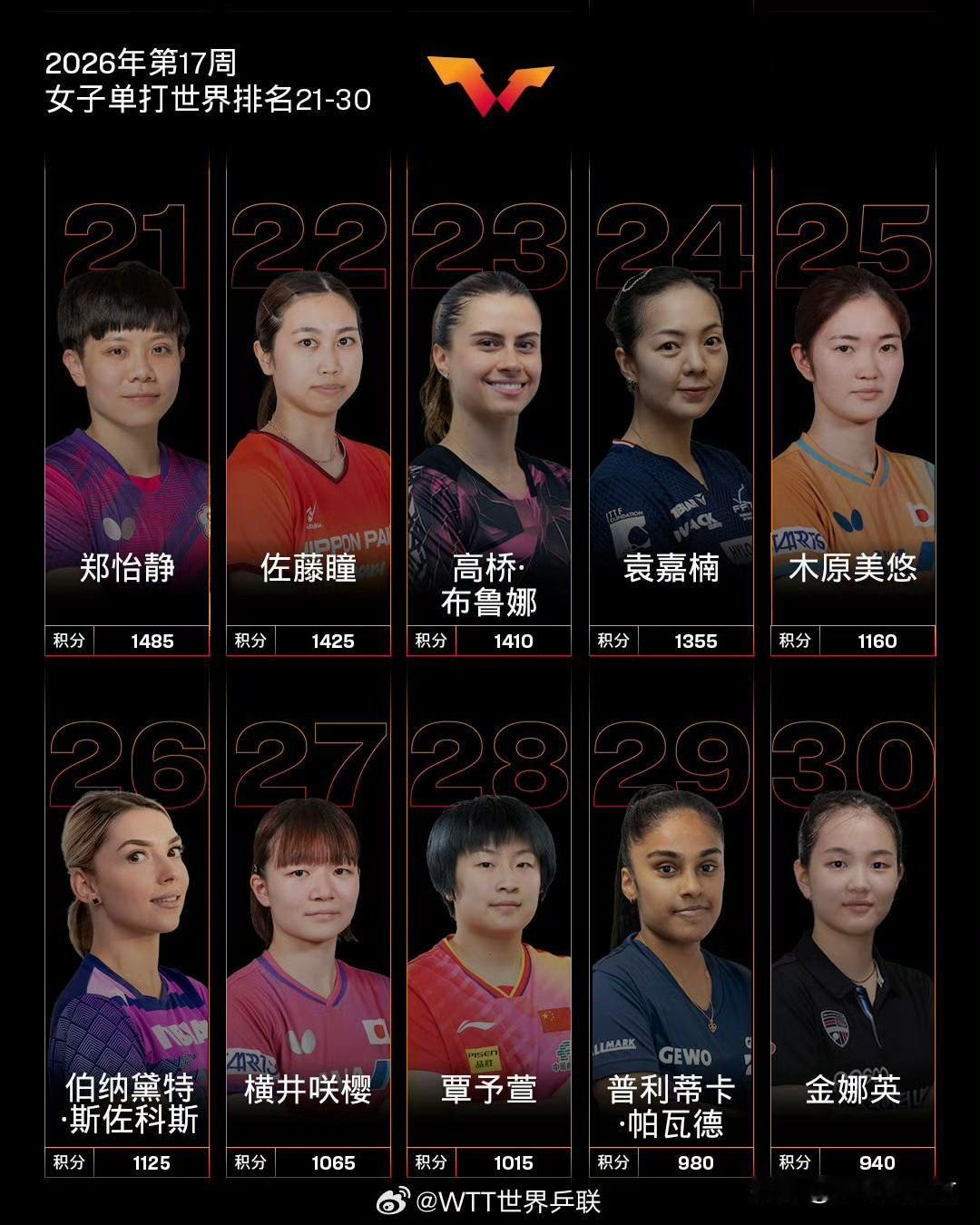 埃及选手汉娜·高达上升2位至第20,中国台北选手黄愉倢大幅上升18位至第65,两人均创下个人职业生涯排名新高。国乒另外两位选手,覃予萱排在第28位,何卓佳位列第37位,排名保持平稳。