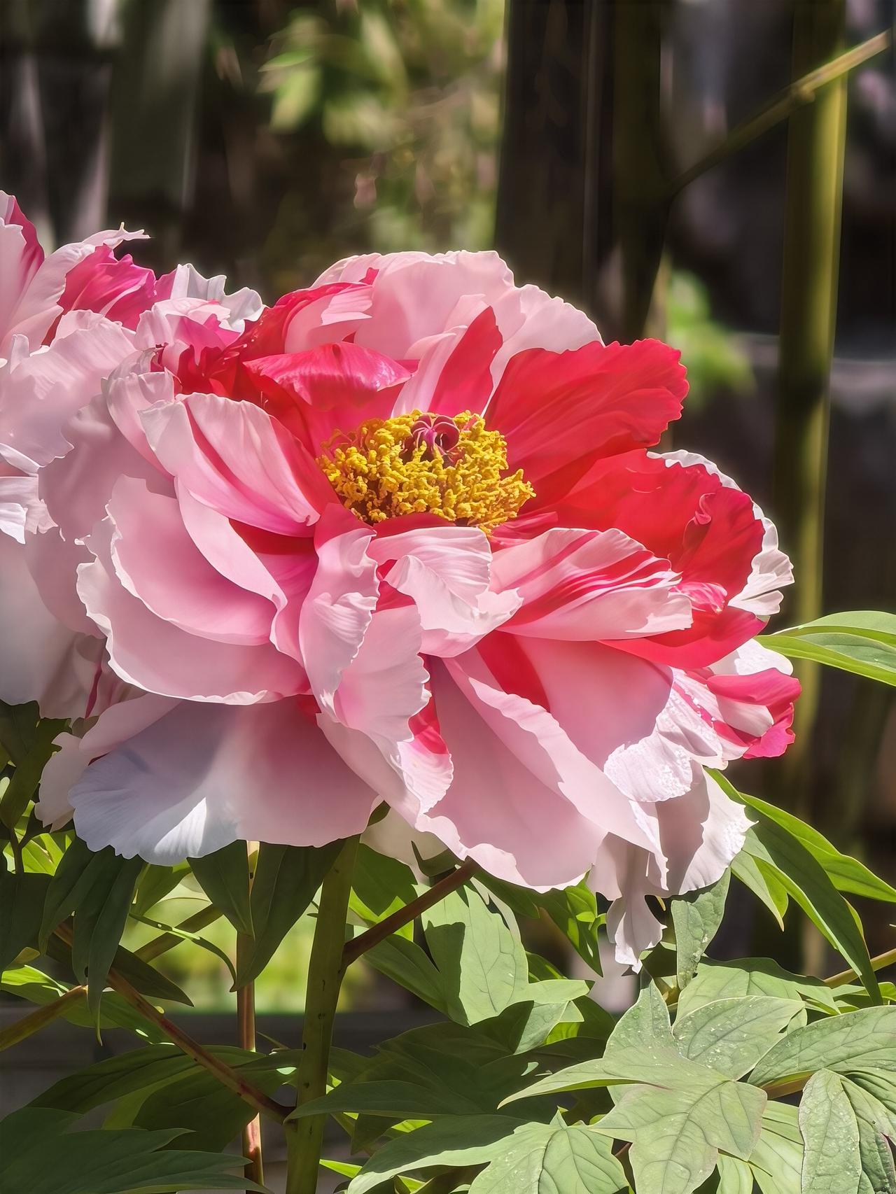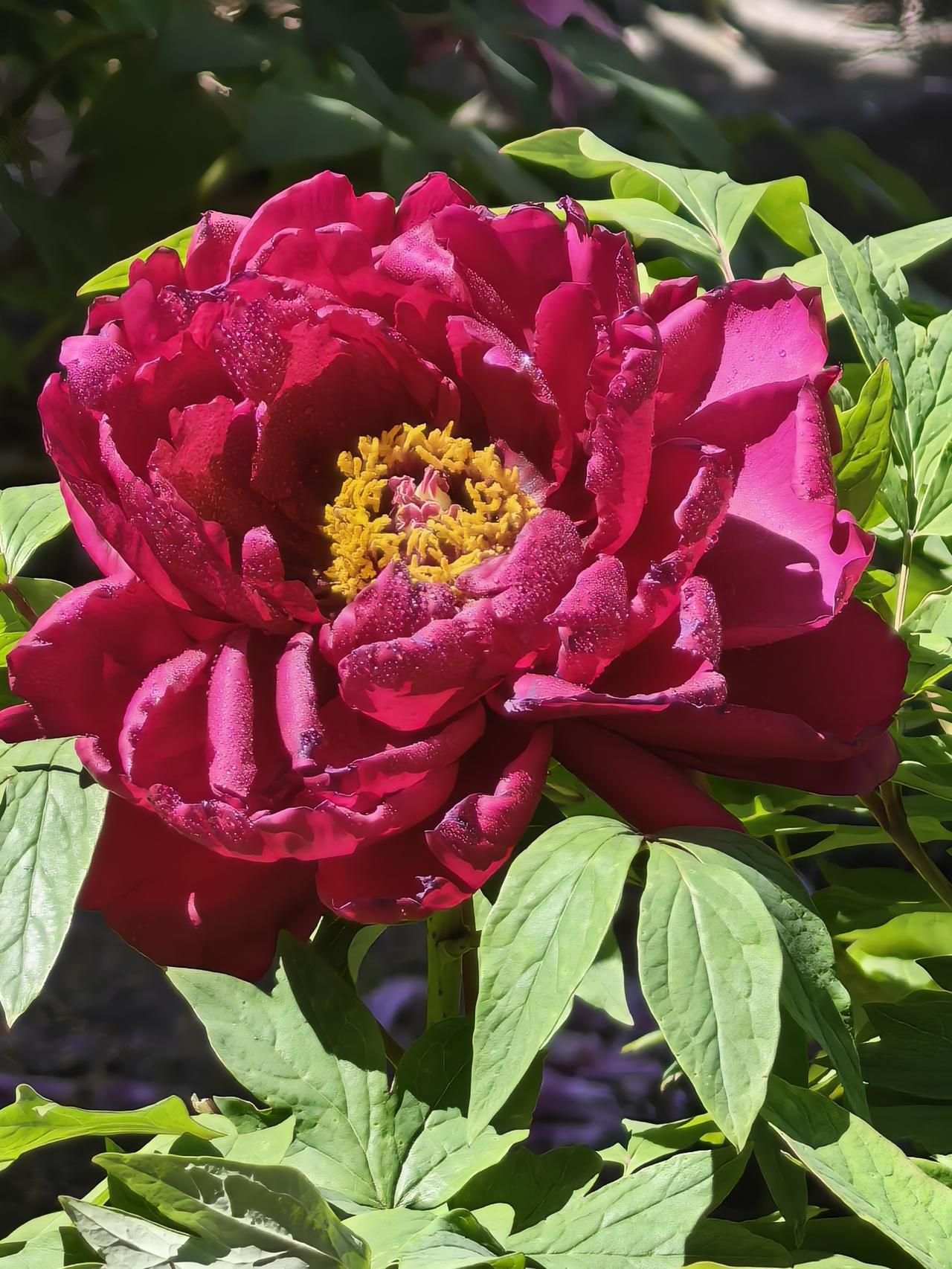 红牡丹开得热烈张扬,尽显花王的雍容霸气。浓艳的正红如烈火燃遍枝头,花瓣层层舒展,纹理清晰如织就的锦缎,在阳光下泛着绒绒的柔光,从外到内晕出深浅错落的艳色。中心金黄的花蕊灿若碎金,与浓烈的红撞出最鲜活的生机,在绿叶的映衬下更显夺目。微风轻拂,花影摇曳,馥郁的香气漫过春野,将一整个春天的热烈都凝在这一朵花里。它不似桃李娇柔,以最磅礴的姿态盛放,用极致的明艳点燃暮春,把岁月的沉淀化作此刻的倾城风华,是春日里最动人心魄的热烈与浪漫。