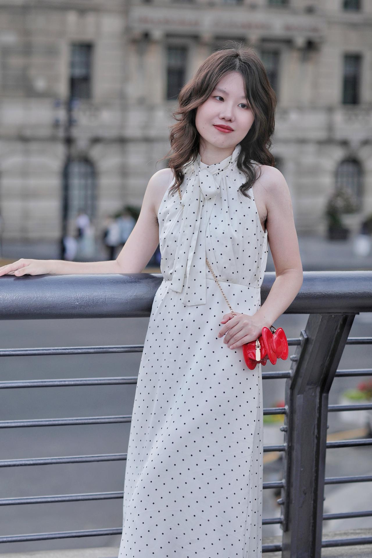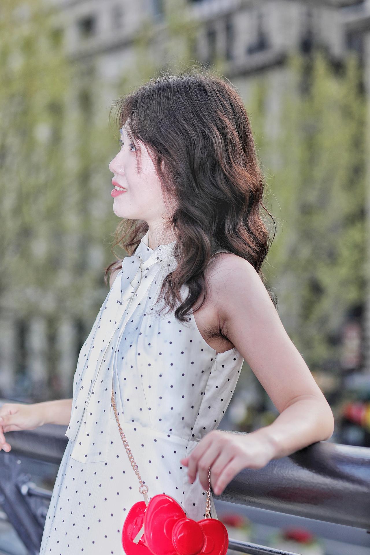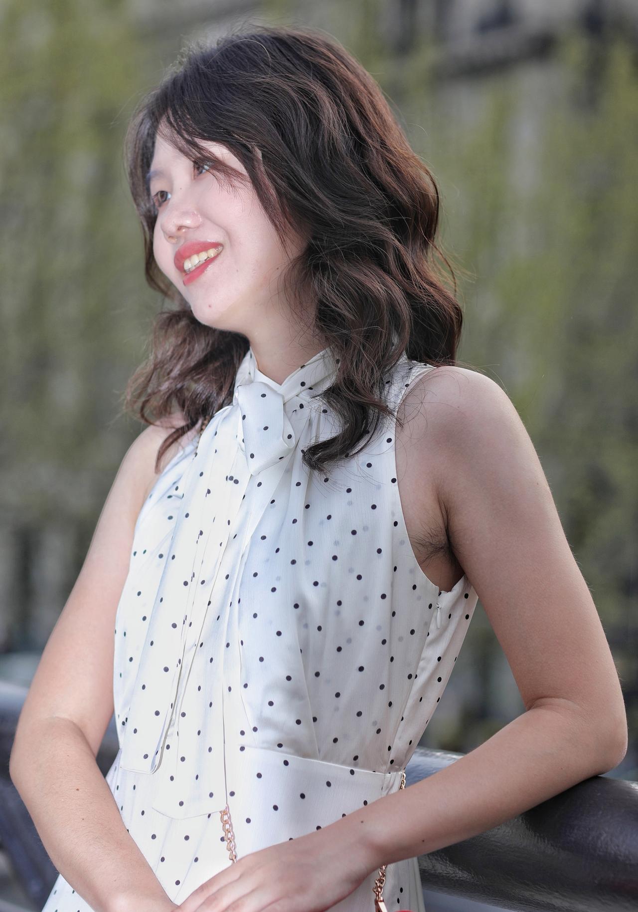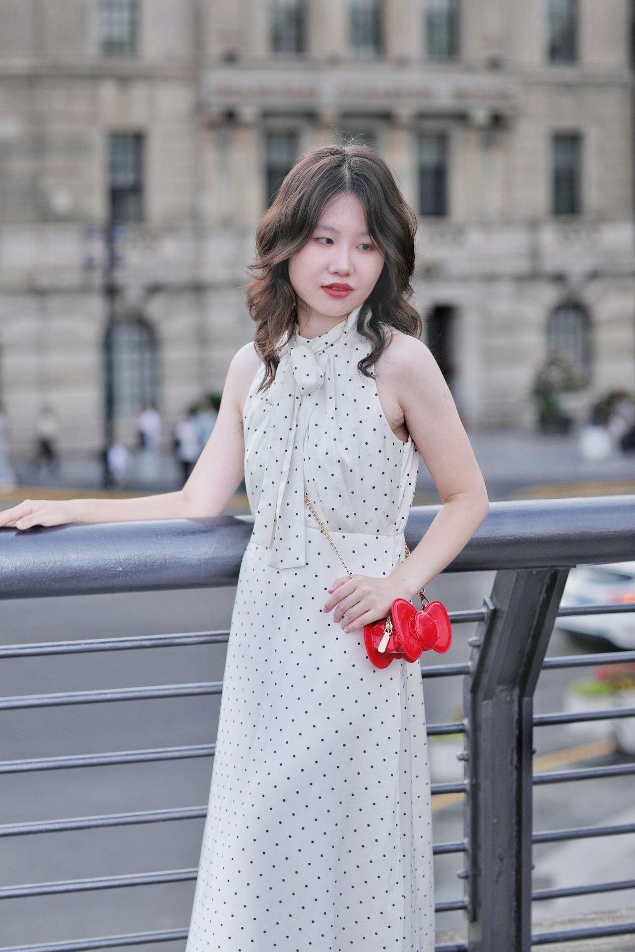 春风拂过发梢,温柔漫过眉眼。她倚在栏杆旁,侧颜在春日光影里晕开温柔的轮廓。深棕卷发带着自然的蓬松弧度,风过时轻扫脸颊,添了几分灵动慵懒。米白底波点挂脖衫系着同系飘带,颈间的蝴蝶结衬得肩颈线条纤细优雅,复古波点与利落剪裁碰撞出法式浪漫。金链斜挎,为素雅穿搭添了精致细节。她望向远方,唇间漾着淡红笑意,眼神里藏着春日的松弛与明媚。背景是朦胧的绿意,将她衬得愈发清透温柔,仿佛把整个春天的浪漫,都定格在这一瞬。