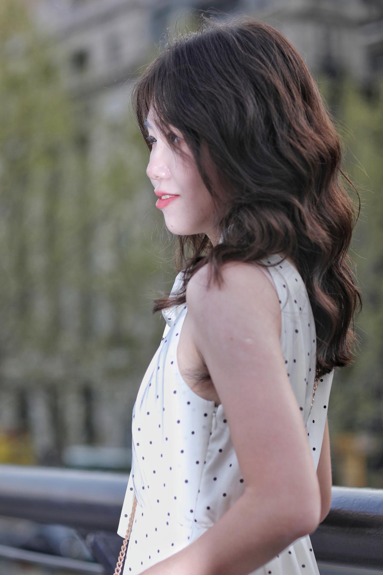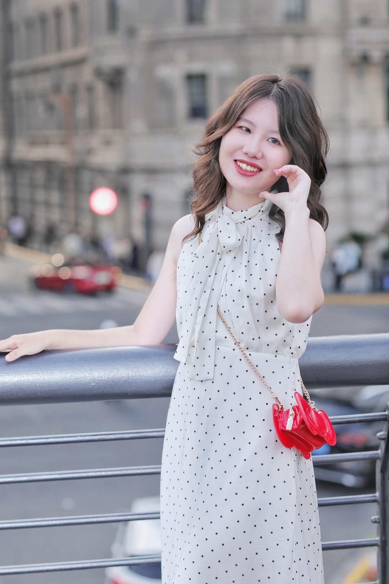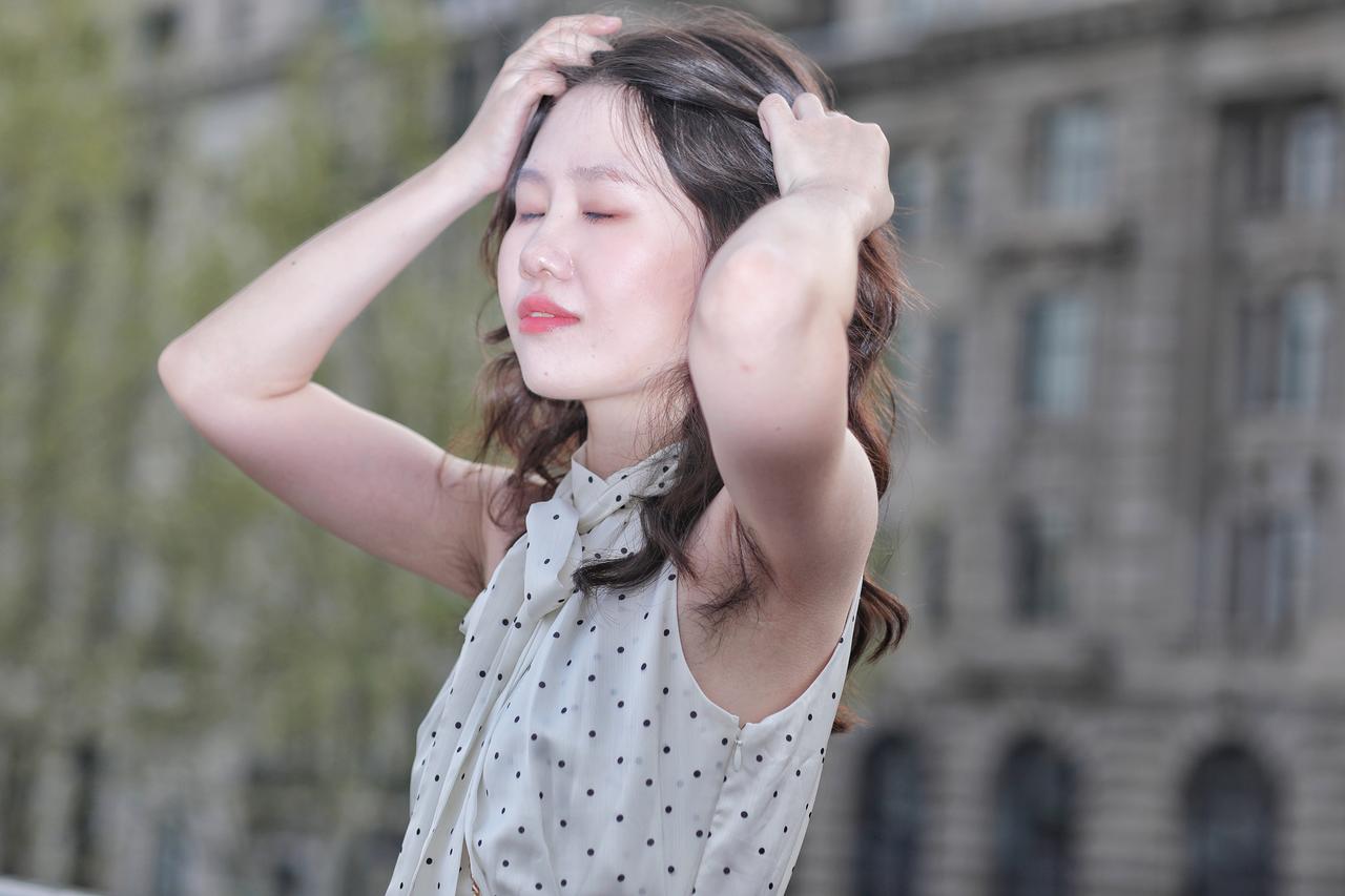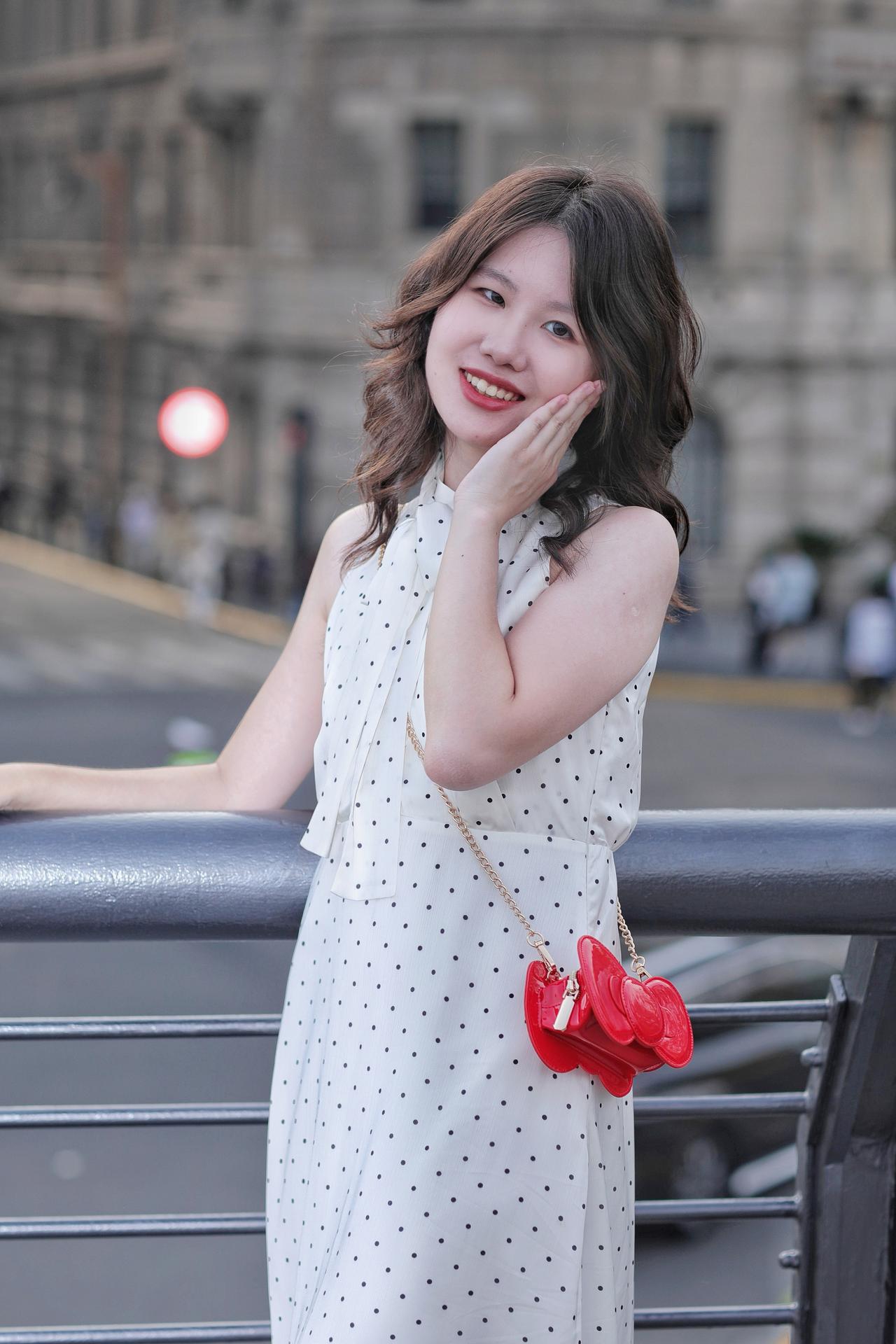 春风拂过发梢,温柔漫过眉眼。她倚在栏杆旁,侧颜在春日光影里晕开温柔的轮廓。深棕卷发带着自然的蓬松弧度,风过时轻扫脸颊,添了几分灵动慵懒。米白底波点挂脖衫系着同系飘带,颈间的蝴蝶结衬得肩颈线条纤细优雅,复古波点与利落剪裁碰撞出法式浪漫。金链斜挎,为素雅穿搭添了精致细节。她望向远方,唇间漾着淡红笑意,眼神里藏着春日的松弛与明媚。背景是朦胧的绿意,将她衬得愈发清透温柔,仿佛把整个春天的浪漫,都定格在这一瞬。