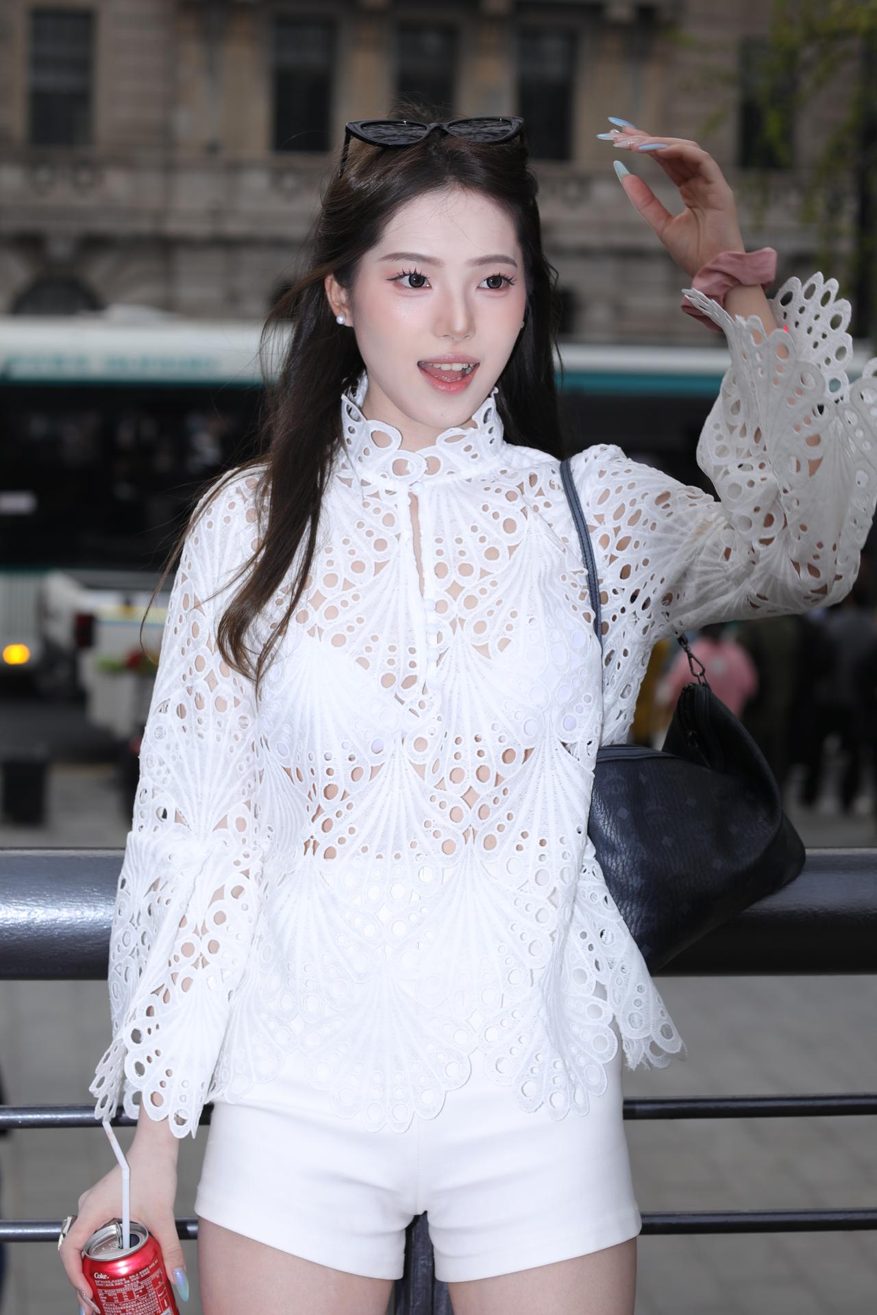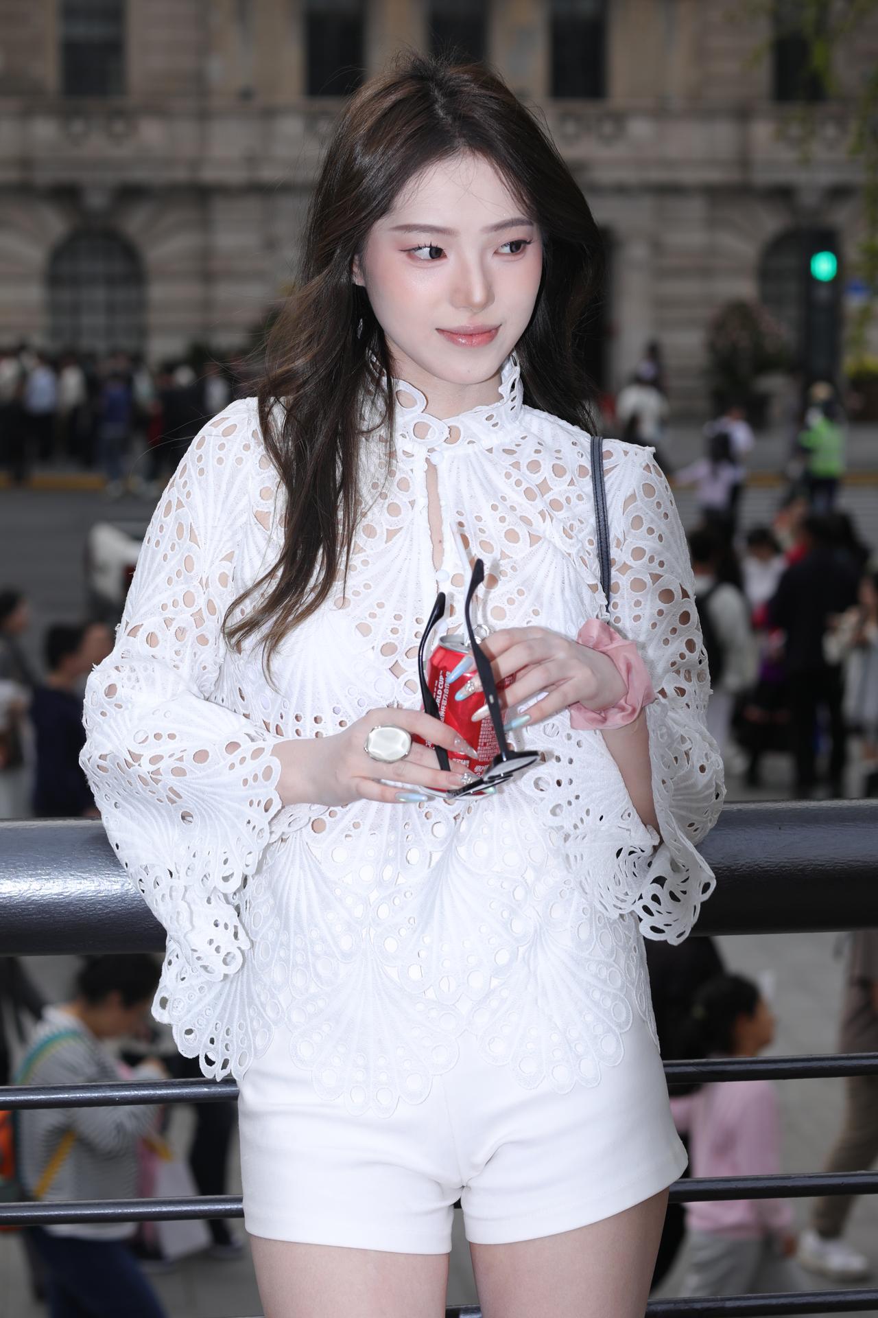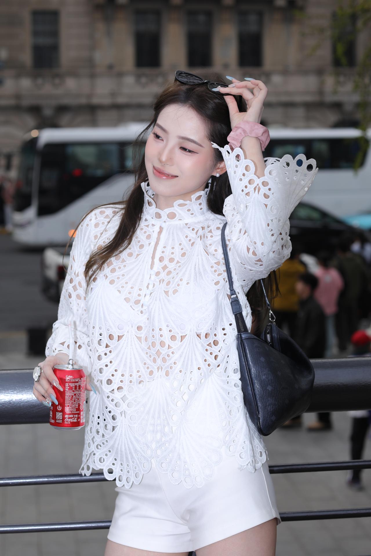 她身着一袭白色镂空蕾丝上衣,精致的花纹如花瓣般层叠,喇叭袖随着轻抬的手臂轻轻晃动,透着法式浪漫的慵懒与精致。简约的白色短裤衬得双腿修长,耳畔的珍珠耳钉与指尖的淡蓝美甲相映,慵懒间透着细腻的小心思。手中握着一罐汽水,红色的罐体与纯白穿搭撞出鲜活色彩,墨镜随意搭在发间,眉眼间是随性又甜美的松弛感。背景里的建筑轮廓朦胧,却衬得她成为街头最动人的风景,这一刻的自在与鲜活,是春日里最动人的注脚。