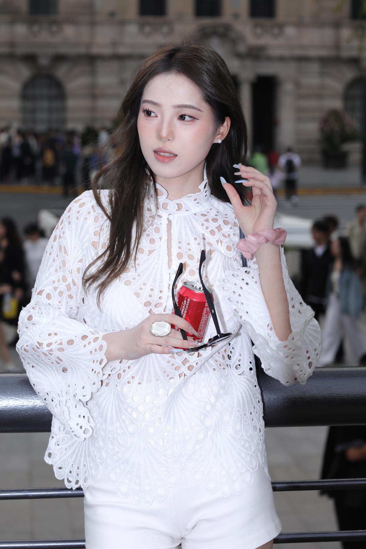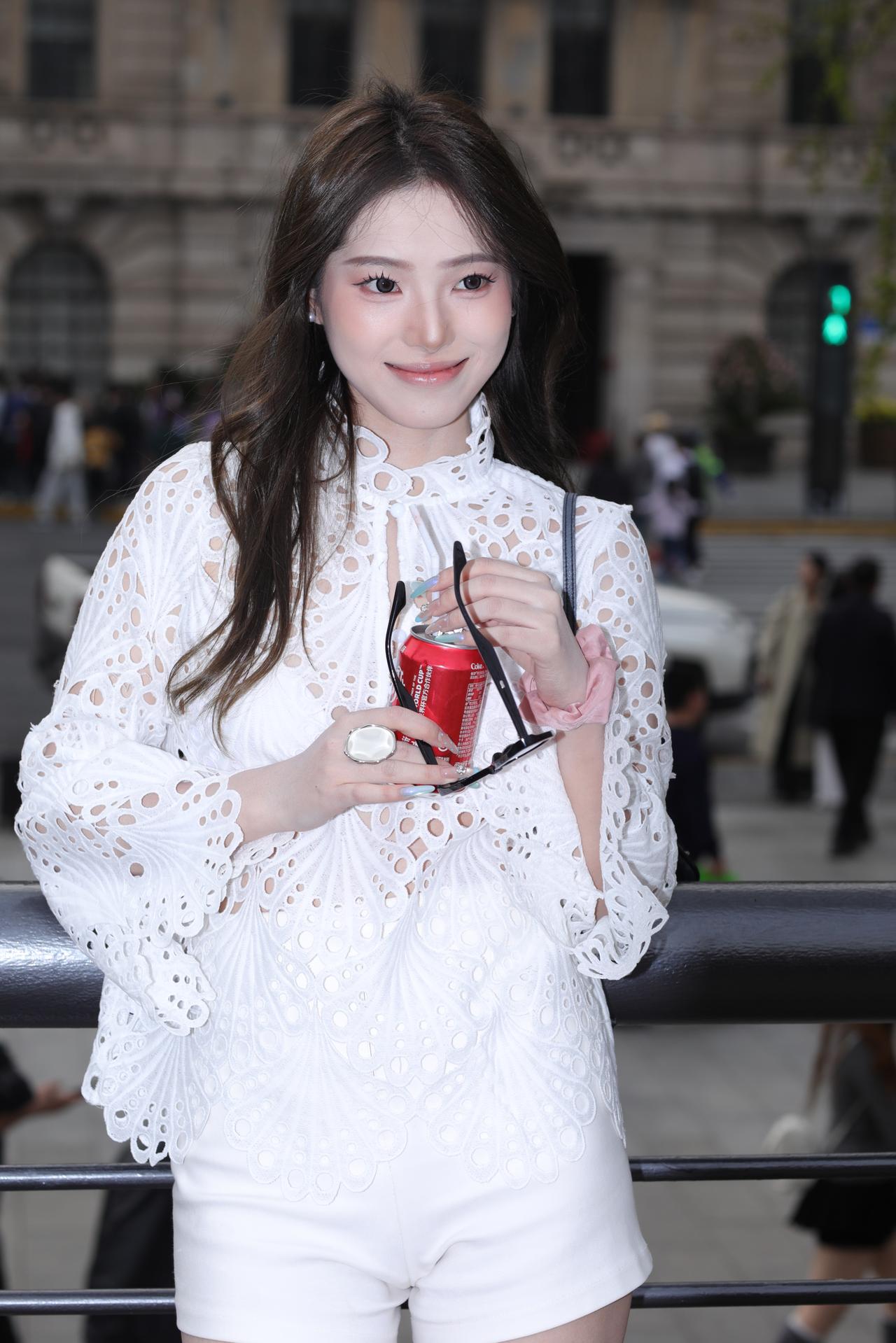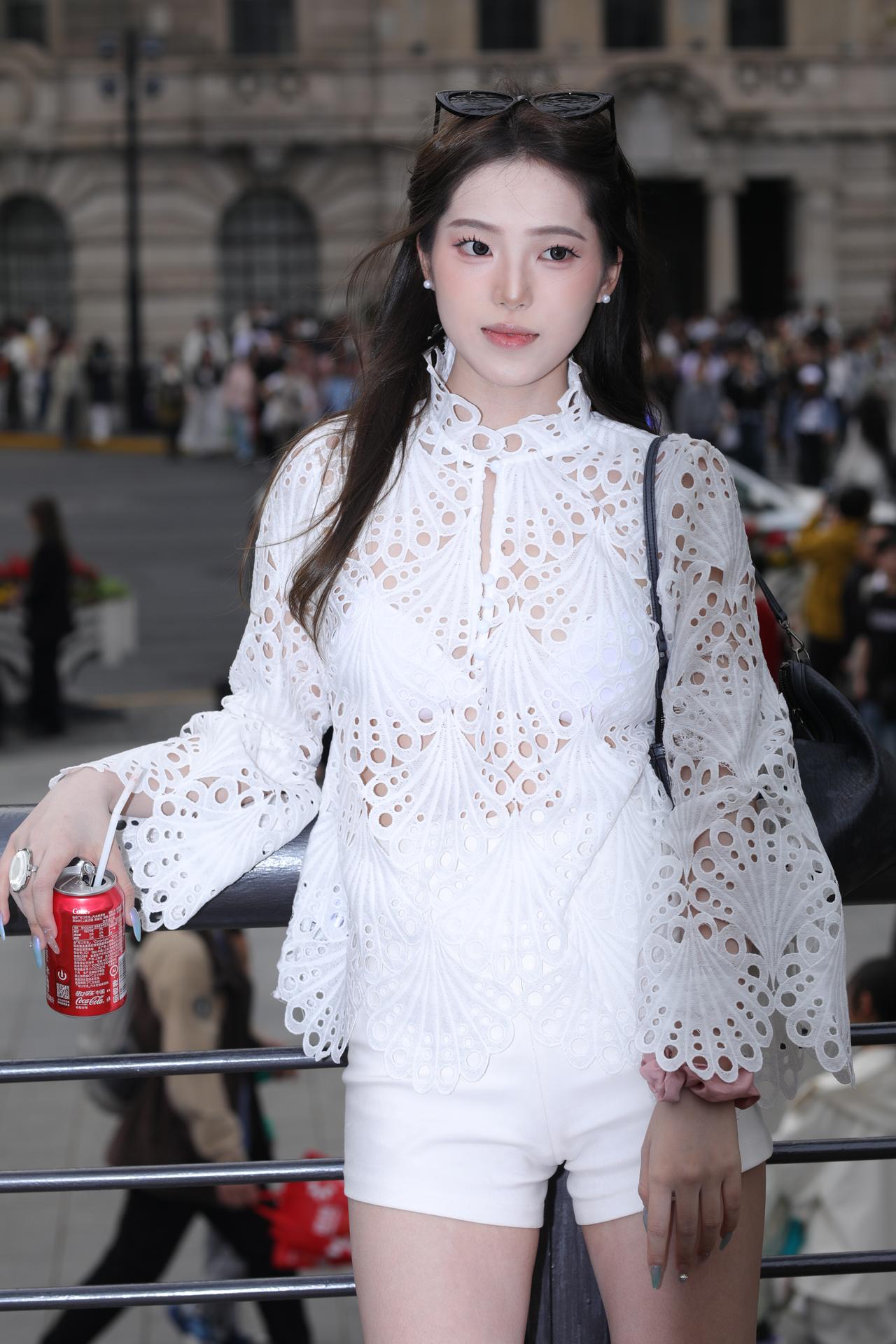 她身着一袭白色镂空蕾丝上衣,精致的花纹如花瓣般层叠,喇叭袖随着轻抬的手臂轻轻晃动,透着法式浪漫的慵懒与精致。简约的白色短裤衬得双腿修长,耳畔的珍珠耳钉与指尖的淡蓝美甲相映,慵懒间透着细腻的小心思。手中握着一罐汽水,红色的罐体与纯白穿搭撞出鲜活色彩,墨镜随意搭在发间,眉眼间是随性又甜美的松弛感。背景里的建筑轮廓朦胧,却衬得她成为街头最动人的风景,这一刻的自在与鲜活,是春日里最动人的注脚。