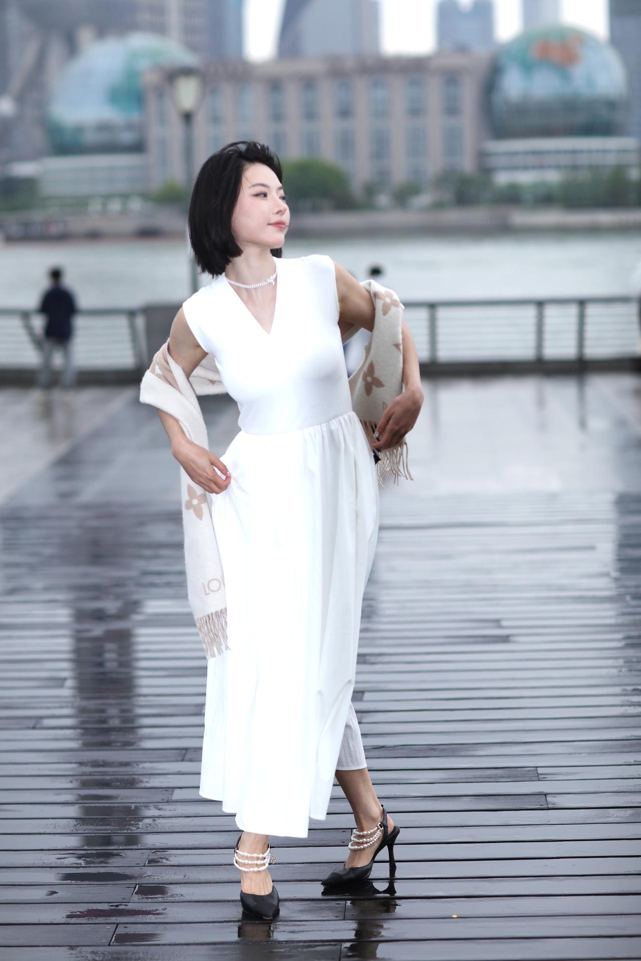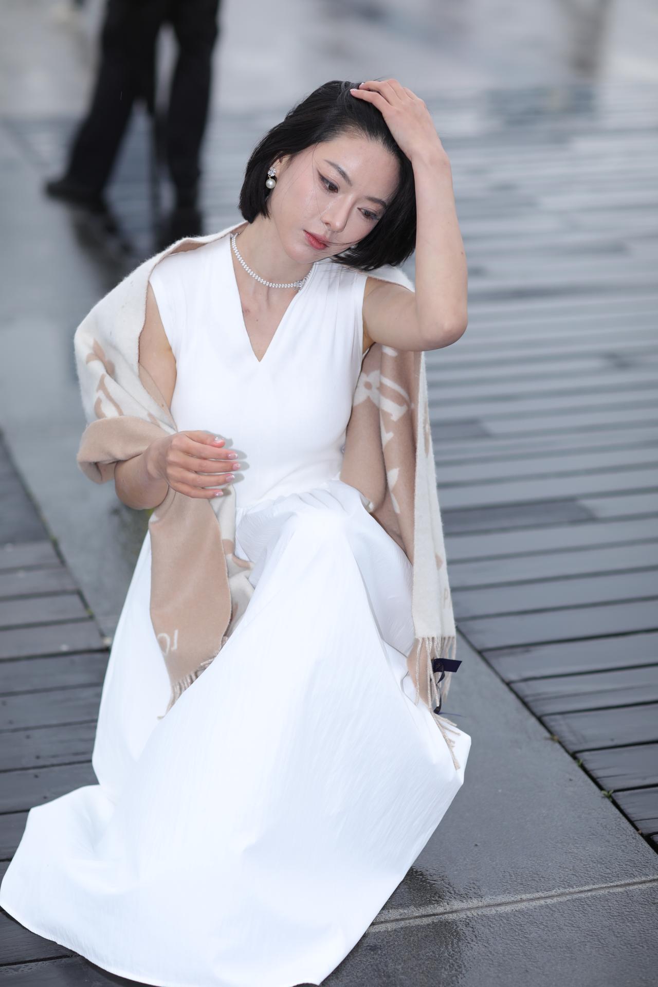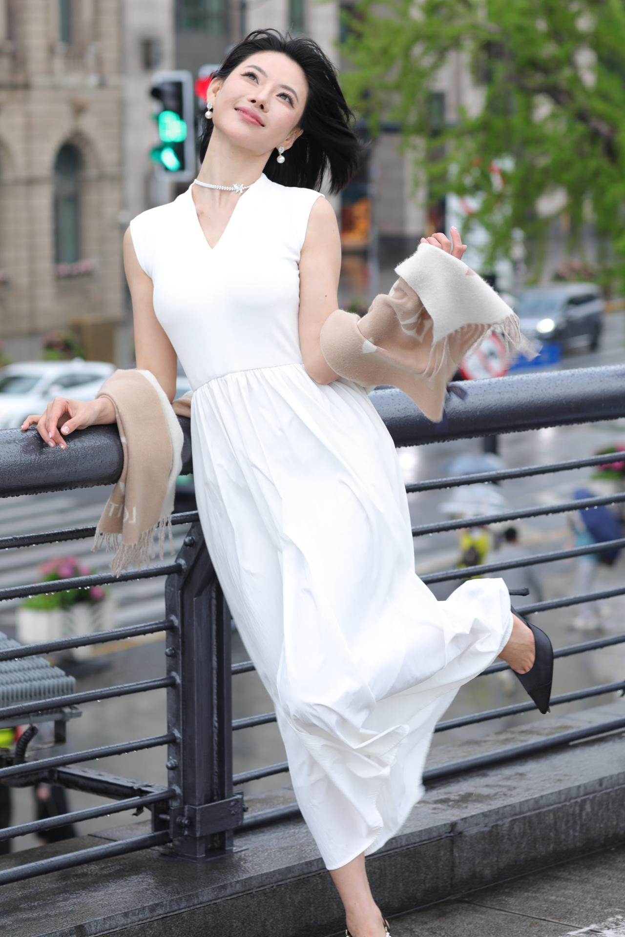 雨湿的木栈道上,她身着一袭素白长裙,垂坠的面料裹着温柔的曲线,浅米色披肩轻覆肩头,将冬日的寒意隔在身外。颈间的碎钻项链与耳畔的珍珠,在清冷的天光里漾着细碎的光。她侧身倚坐,指尖轻触发丝,眼波低垂,像一首留白的诗,把都市的喧嚣都揉进了这一刻的静谧。