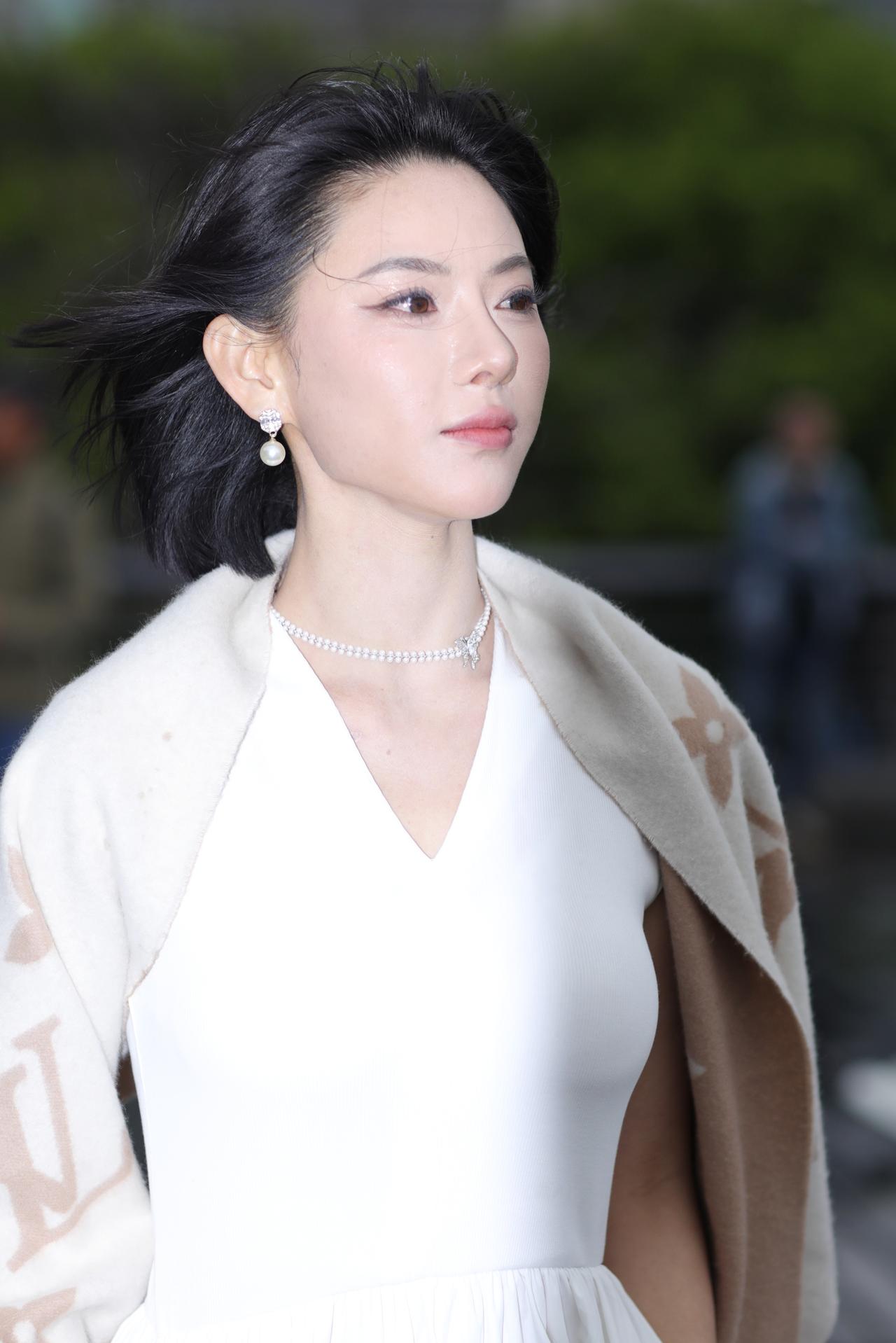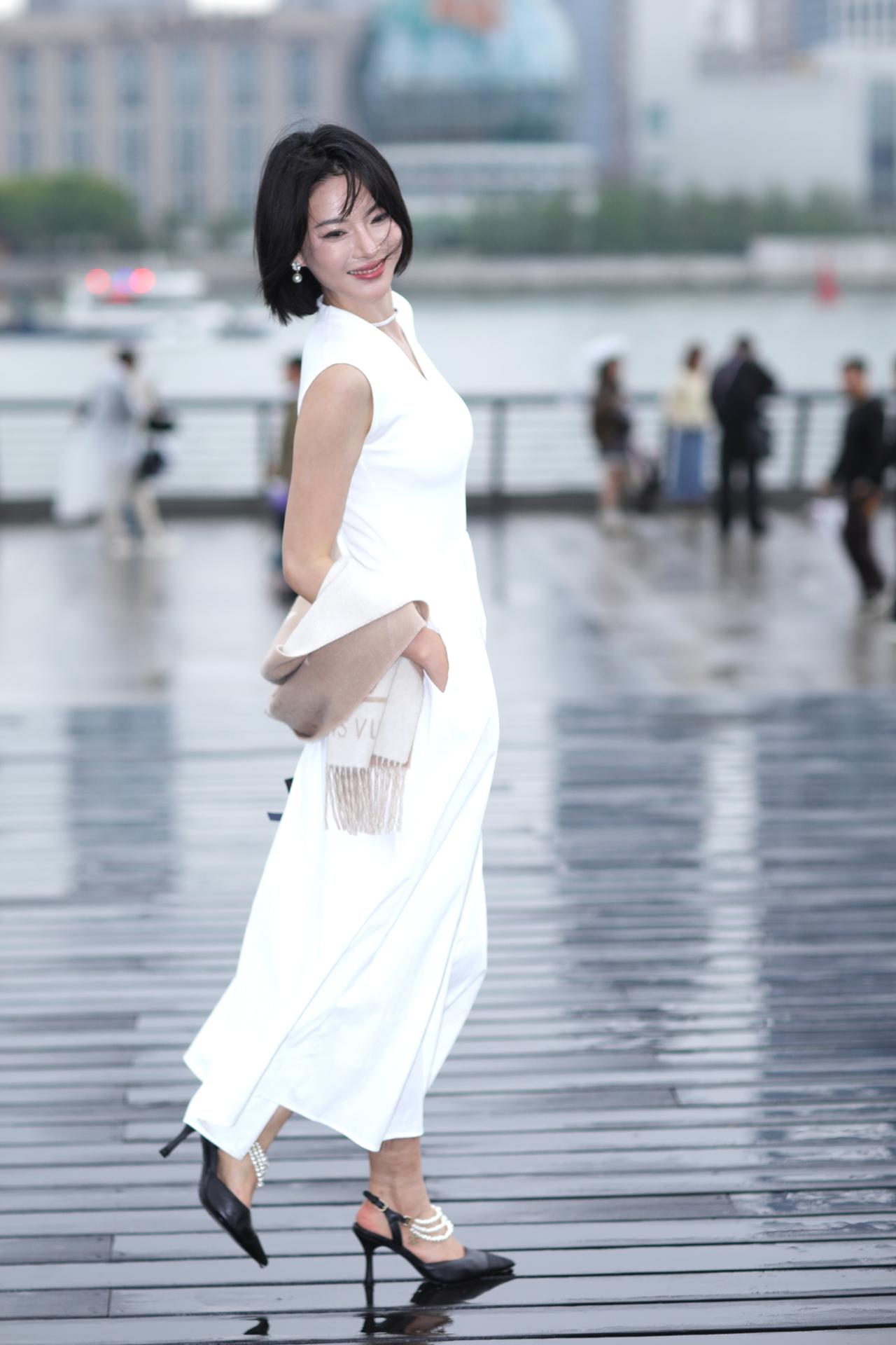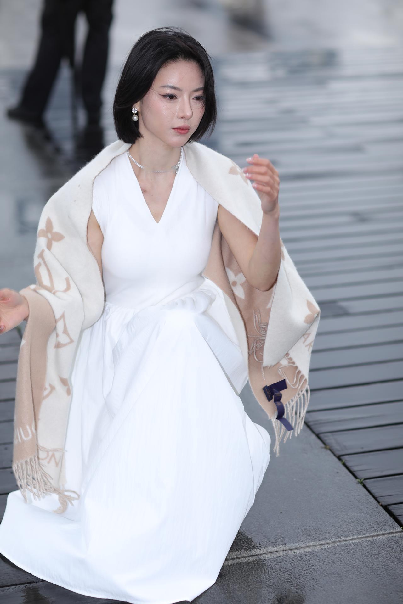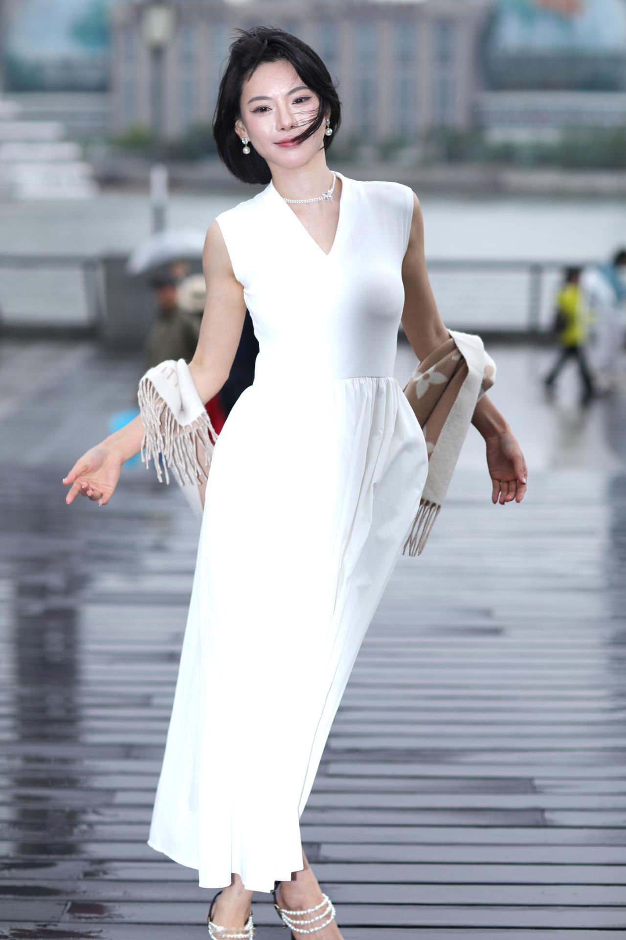 雨湿的木栈道上,她身着一袭素白长裙,垂坠的面料裹着温柔的曲线,浅米色披肩轻覆肩头,将冬日的寒意隔在身外。颈间的碎钻项链与耳畔的珍珠,在清冷的天光里漾着细碎的光。她侧身倚坐,指尖轻触发丝,眼波低垂,像一首留白的诗,把都市的喧嚣都揉进了这一刻的静谧。