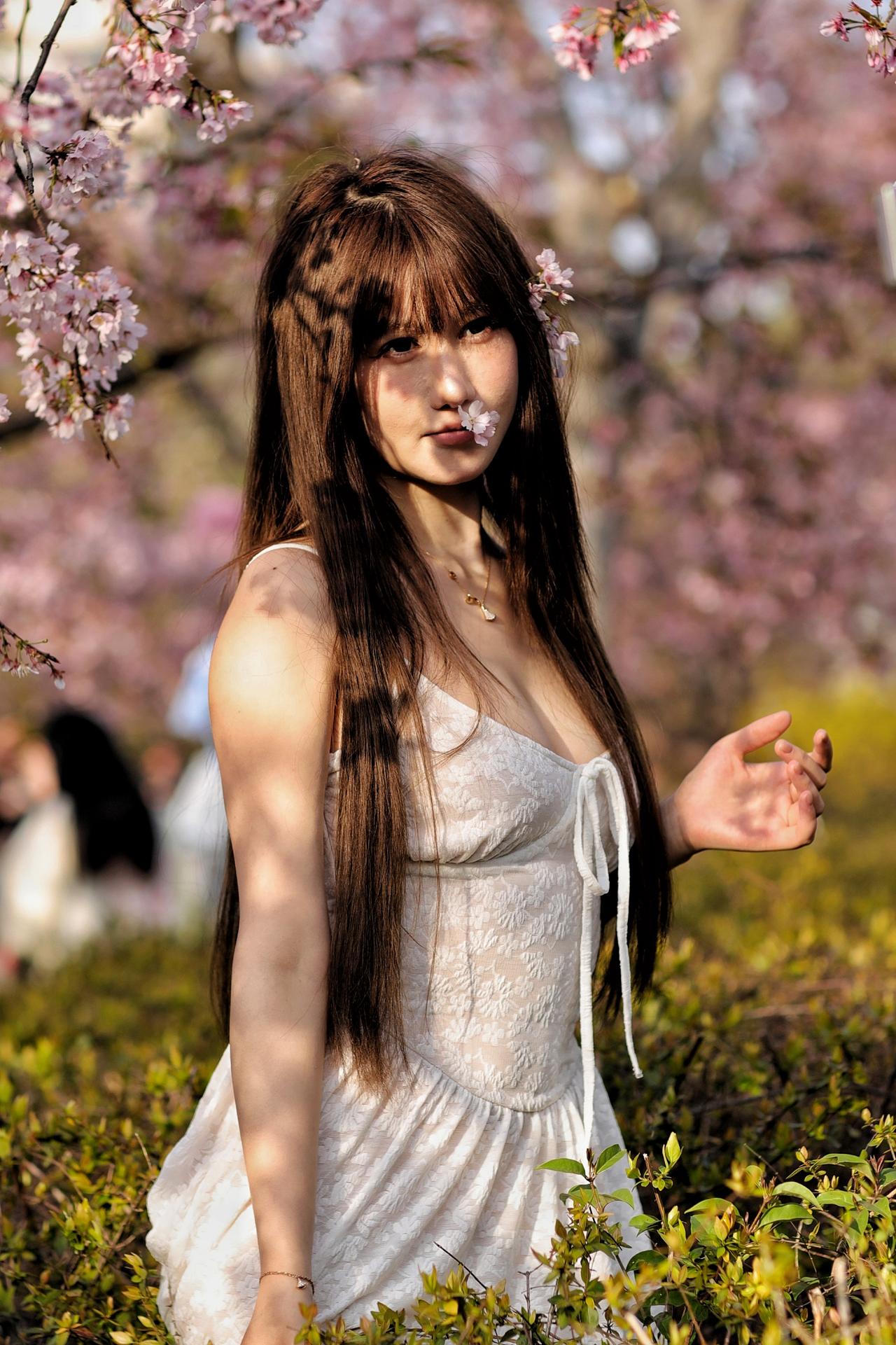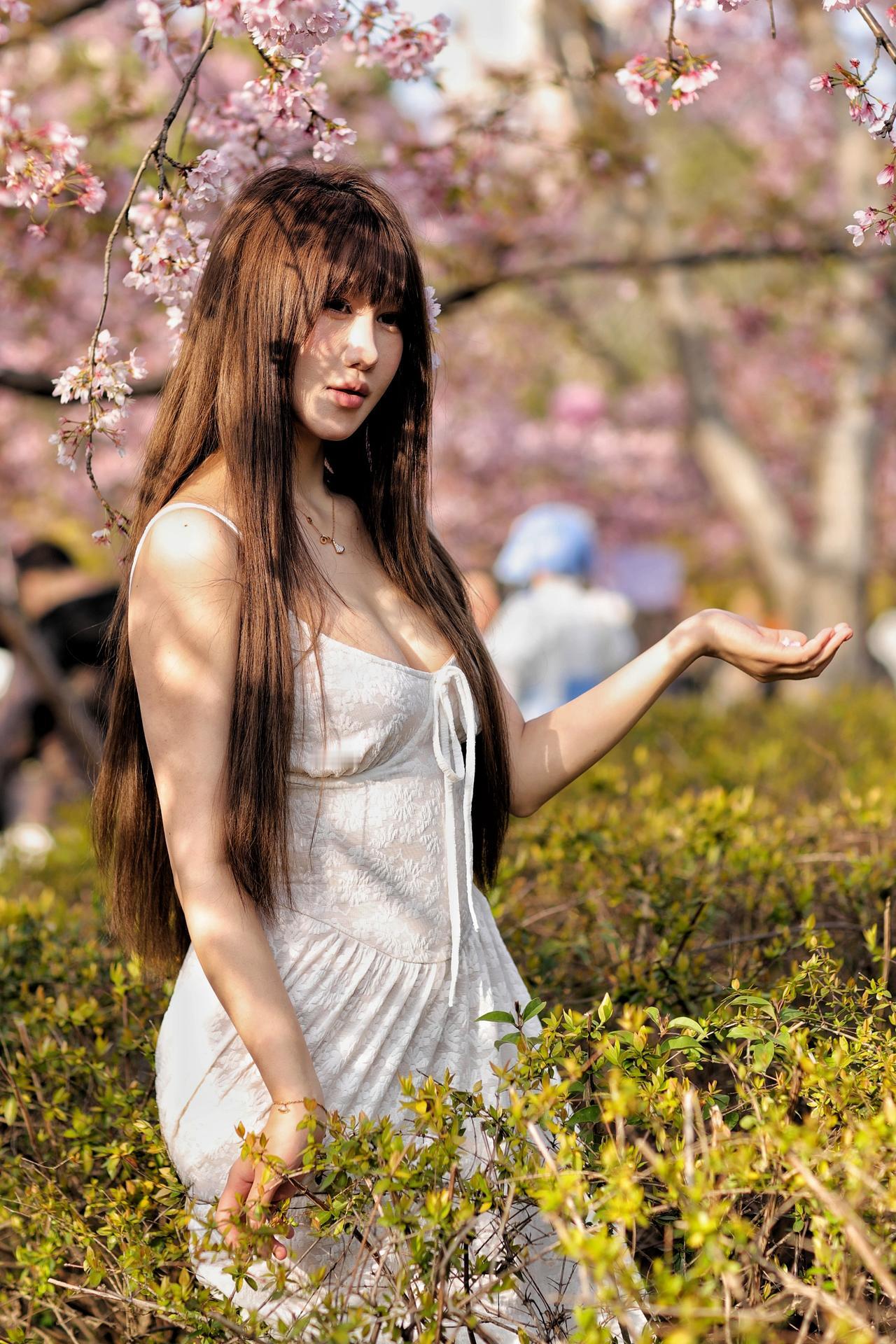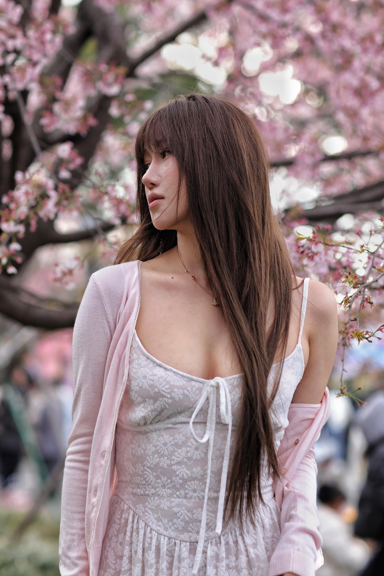 春风漫过枝头,粉白樱花如云似雪,漫溢成一整个春日的温柔。少女立于花影之间,长发如瀑垂落,齐刘海衬得眉眼愈发清透灵动。她身着奶白蕾丝吊带裙,肌理间浮着细碎的花纹,外搭一件淡粉针织开衫,柔化了线条,添了几分慵懒松弛。颈间细链轻晃,碎钻在花光里闪着微光,与漫天樱色相映成趣。她抬眼望向镜头外,眼神里藏着春日的朦胧与怅然,仿佛将一整个花季的浪漫都揉进了眼底。1