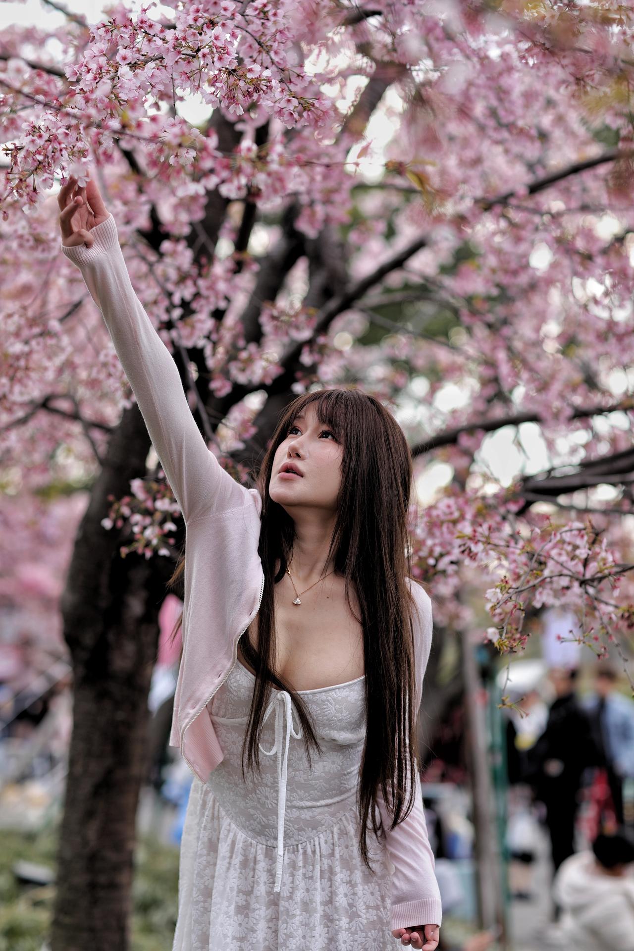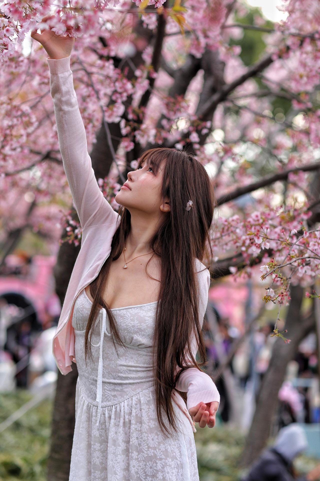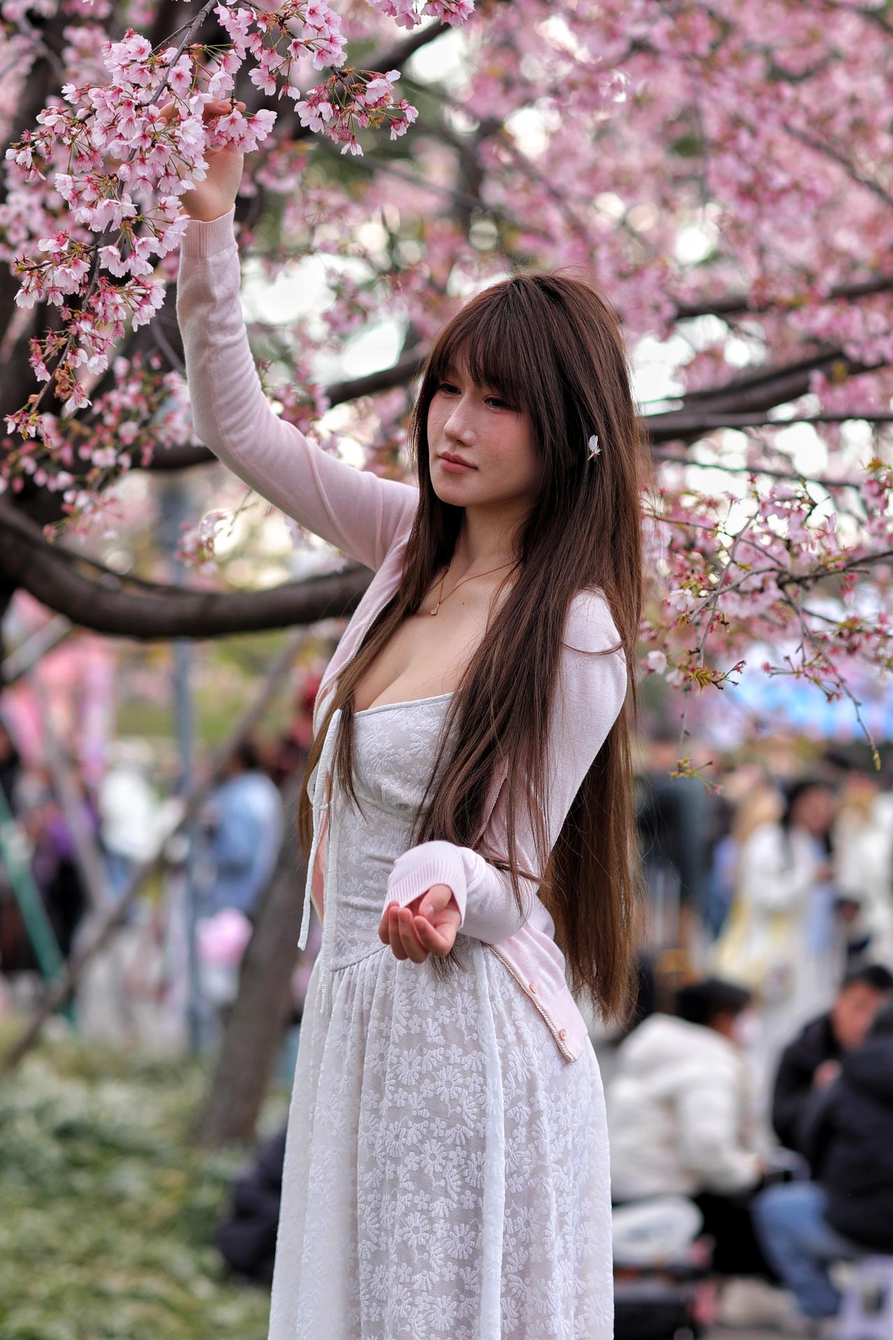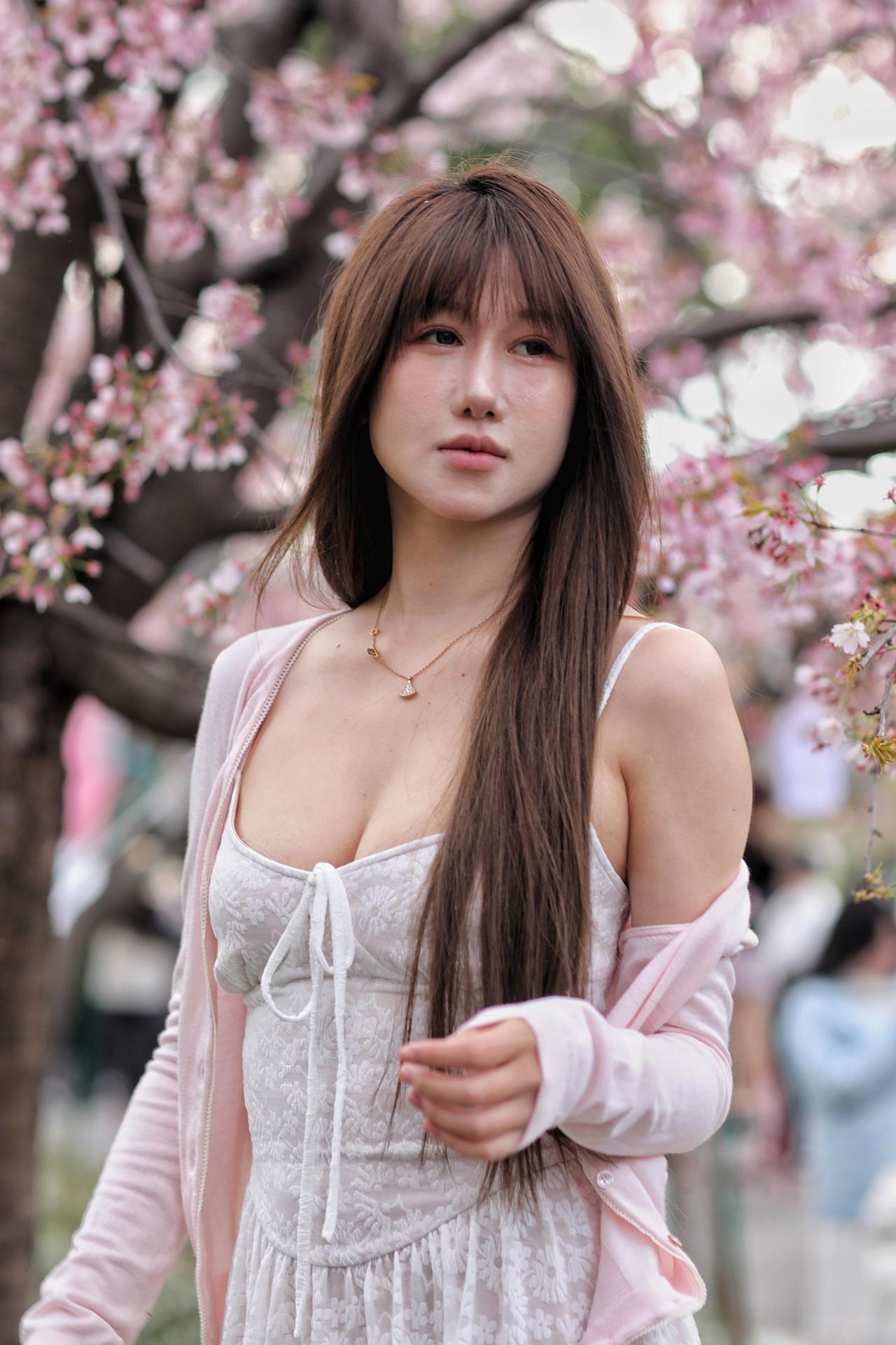 春风漫过枝头,粉白樱花如云似雪,漫溢成一整个春日的温柔。少女立于花影之间,长发如瀑垂落,齐刘海衬得眉眼愈发清透灵动。她身着奶白蕾丝吊带裙,肌理间浮着细碎的花纹,外搭一件淡粉针织开衫,柔化了线条,添了几分慵懒松弛。颈间细链轻晃,碎钻在花光里闪着微光,与漫天樱色相映成趣。她抬眼望向镜头外,眼神里藏着春日的朦胧与怅然,仿佛将一整个花季的浪漫都揉进了眼底。1