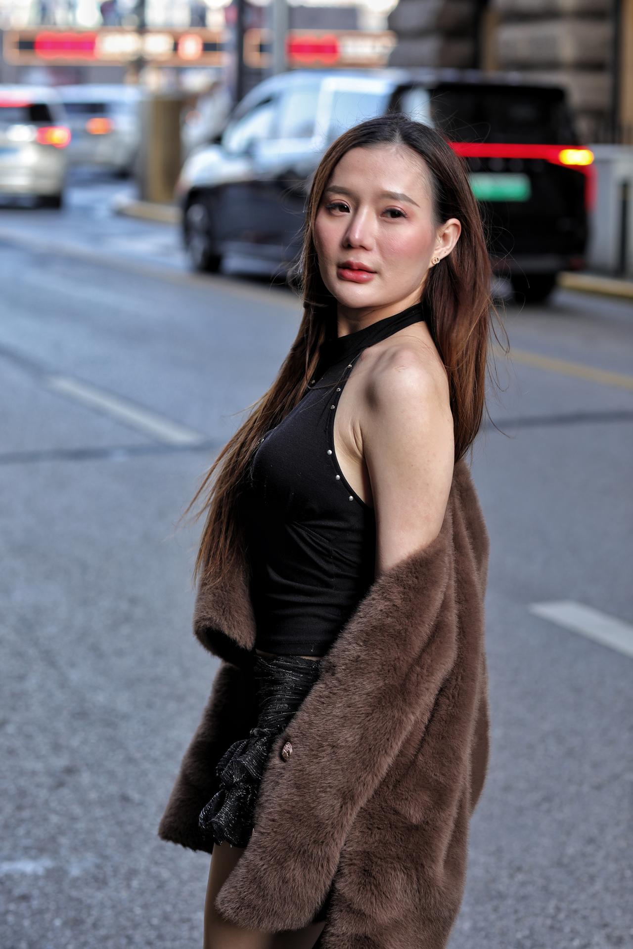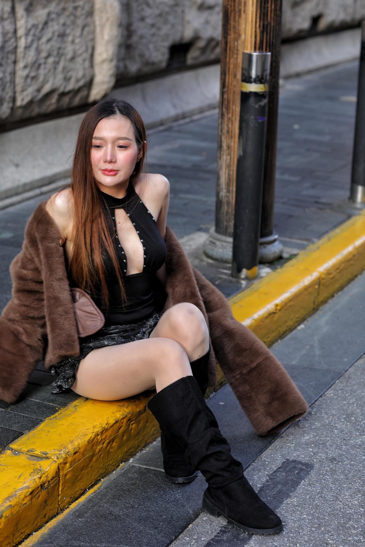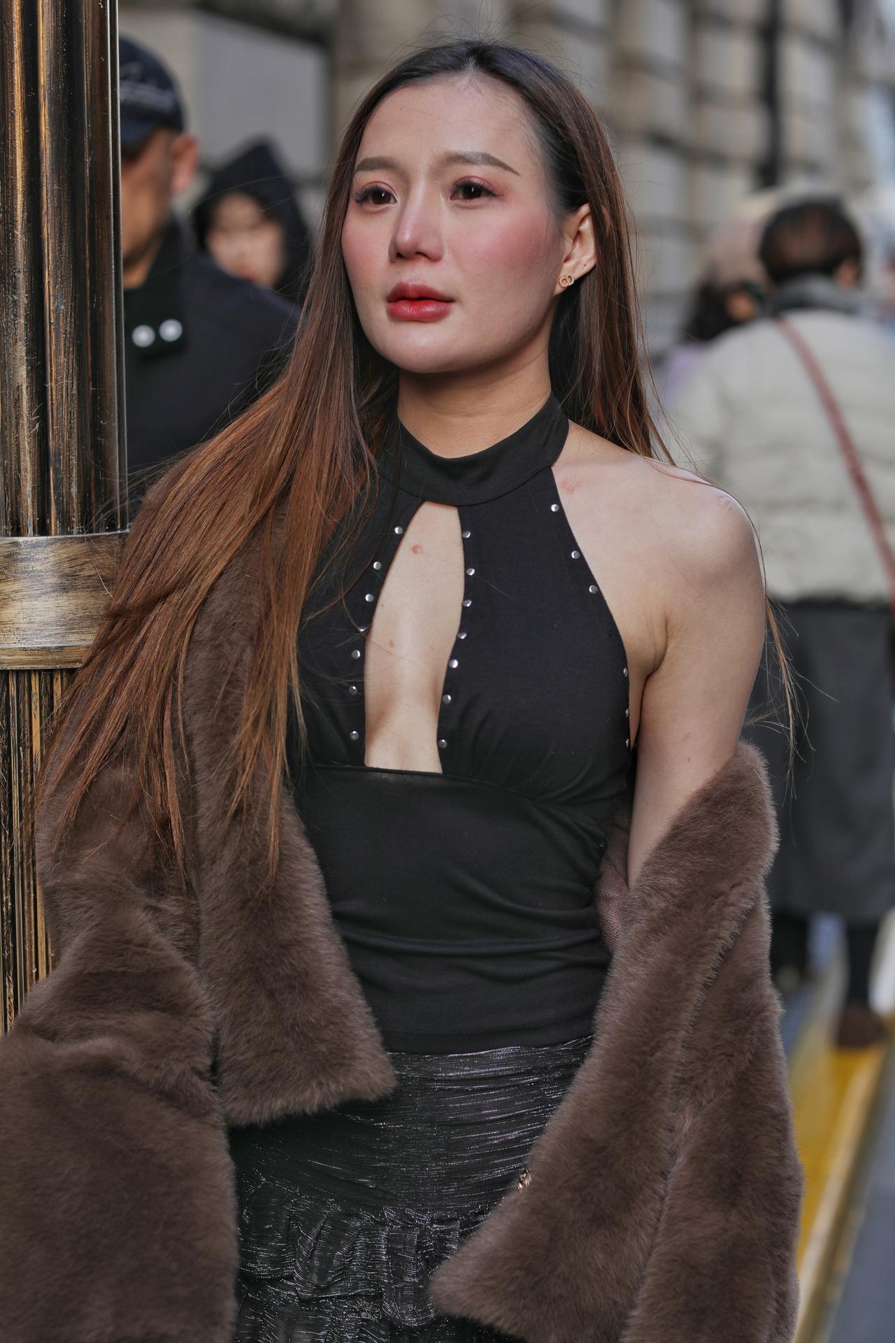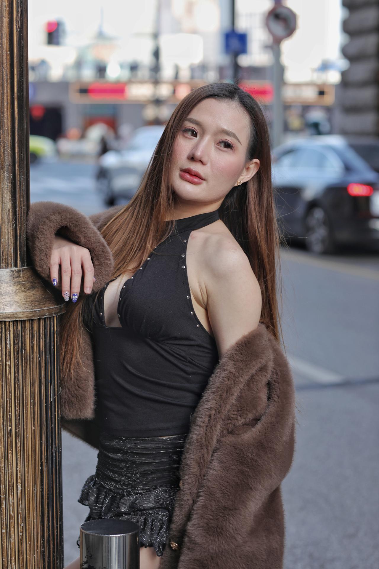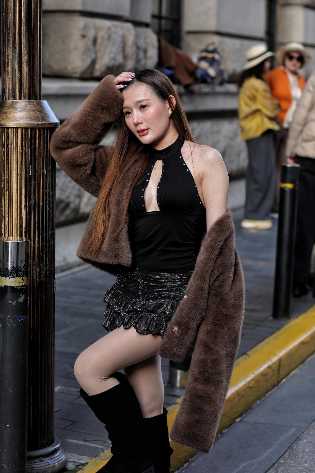 都市街头,暖阳为街景镀上温柔滤镜。她倚着复古灯柱,棕调毛绒外套慵懒滑落肩头,随性又贵气。黑色挂脖挖空上衣缀满银钉,勾勒出玲珑曲线,性感与精致并存;银黑褶皱短裙摇曳生姿,衬得双腿纤细修长,搭配绒面长靴,酷飒中透着妩媚。棕发随风轻扬,妆容明艳,抬手间尽显松弛氛围感。