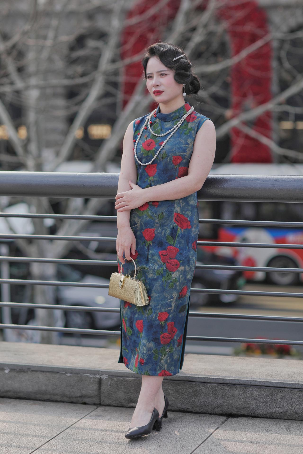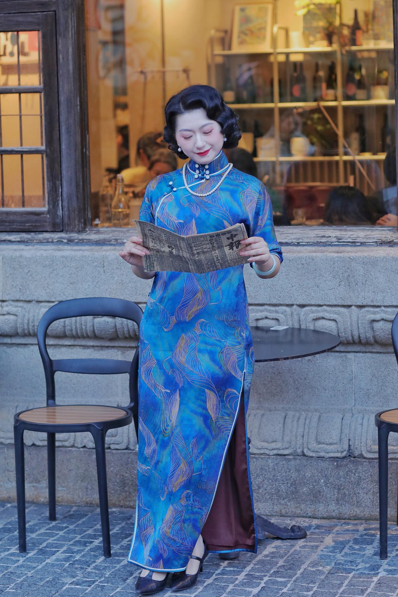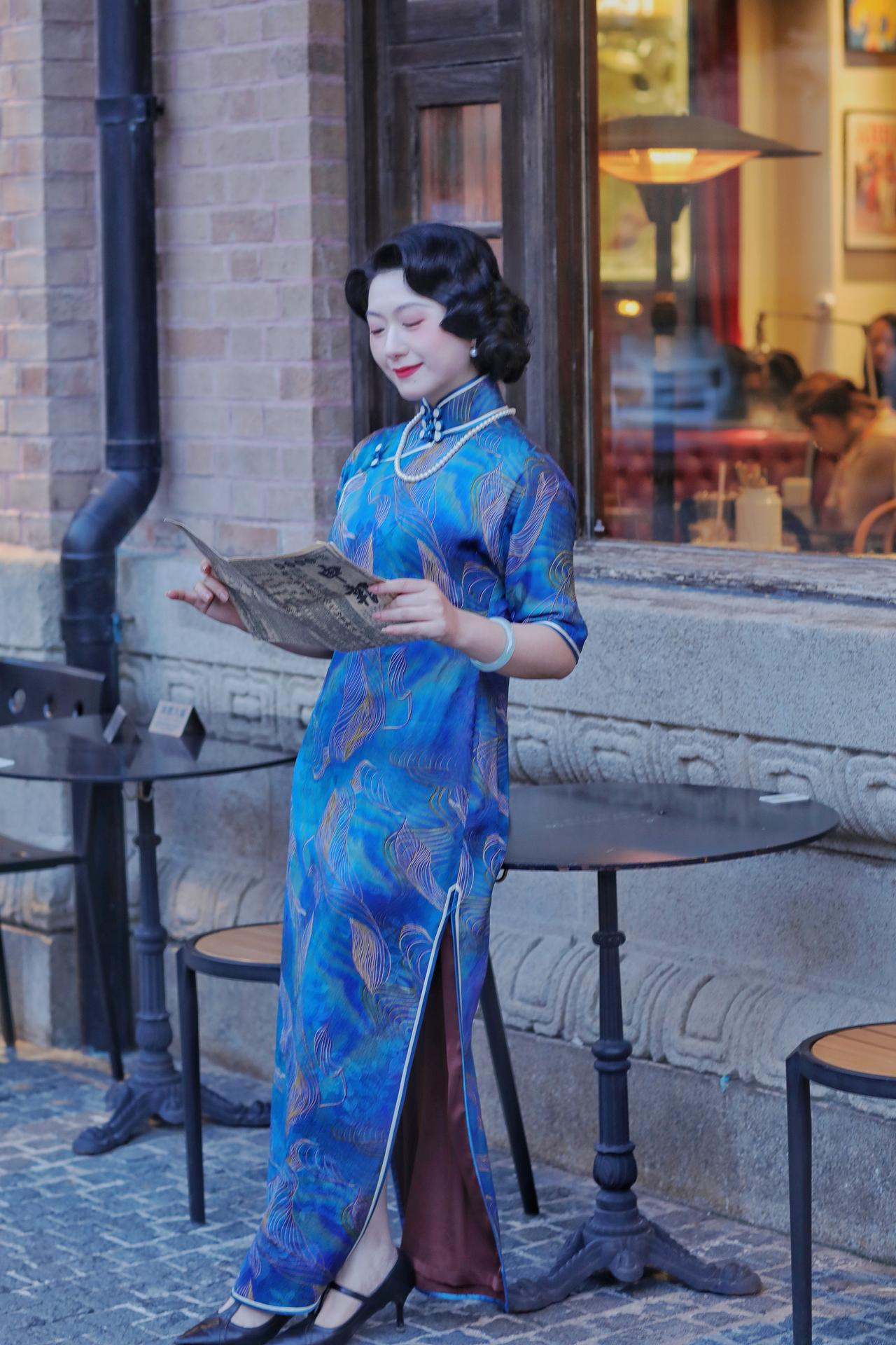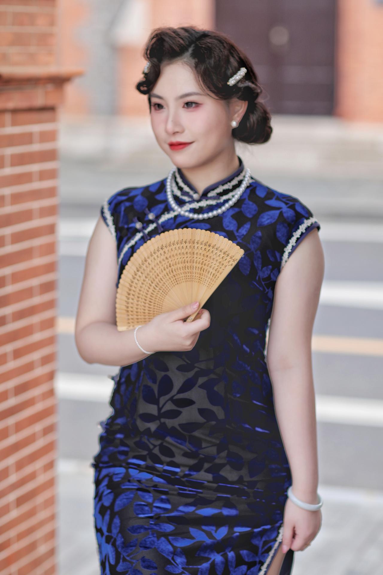 一袭藏蓝暗纹旗袍勾勒出民国女子的绰约风姿。珍珠领饰衬得脖颈纤细,白边盘扣沿襟而下,暗纹在光影里若隐若现,复古卷发别着珍珠发簪,红唇似火,眼波流转间尽是老上海的风情万种。她执一柄素竹折扇,倚着红砖街角,一步踏在石阶上,旗袍开衩处露着纤细脚踝,黑布鞋踩出岁月的温柔。风拂过发梢,仿佛穿越回十里洋场,将旧时代的优雅与妩媚,定格成一帧永不褪色的老照片,每一寸线条都写满了东方女性的温婉与风情。